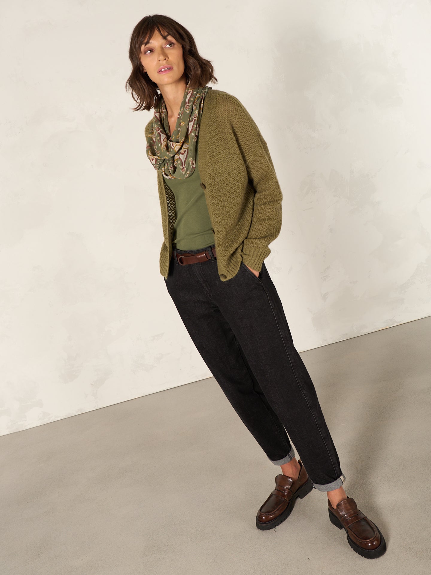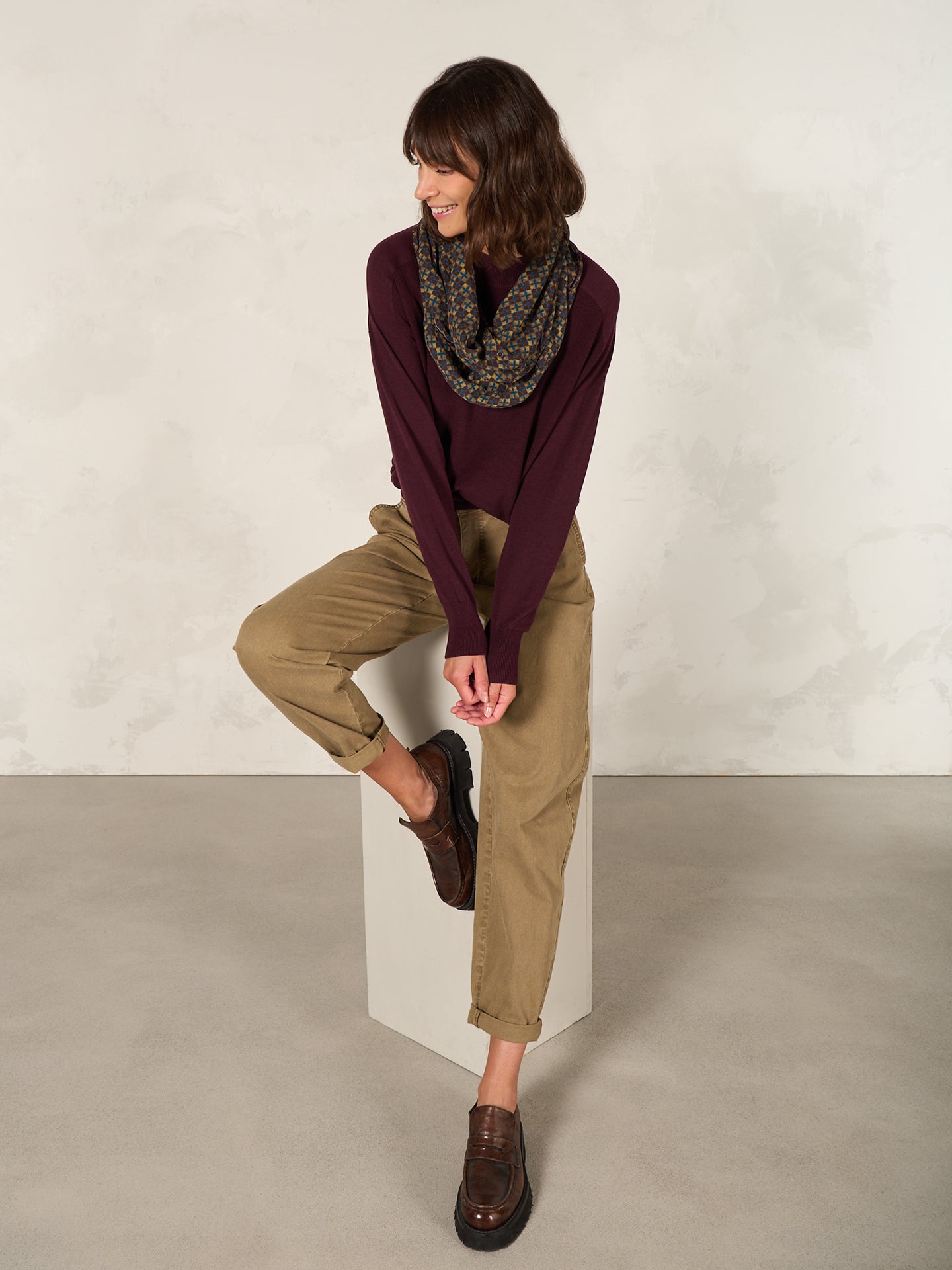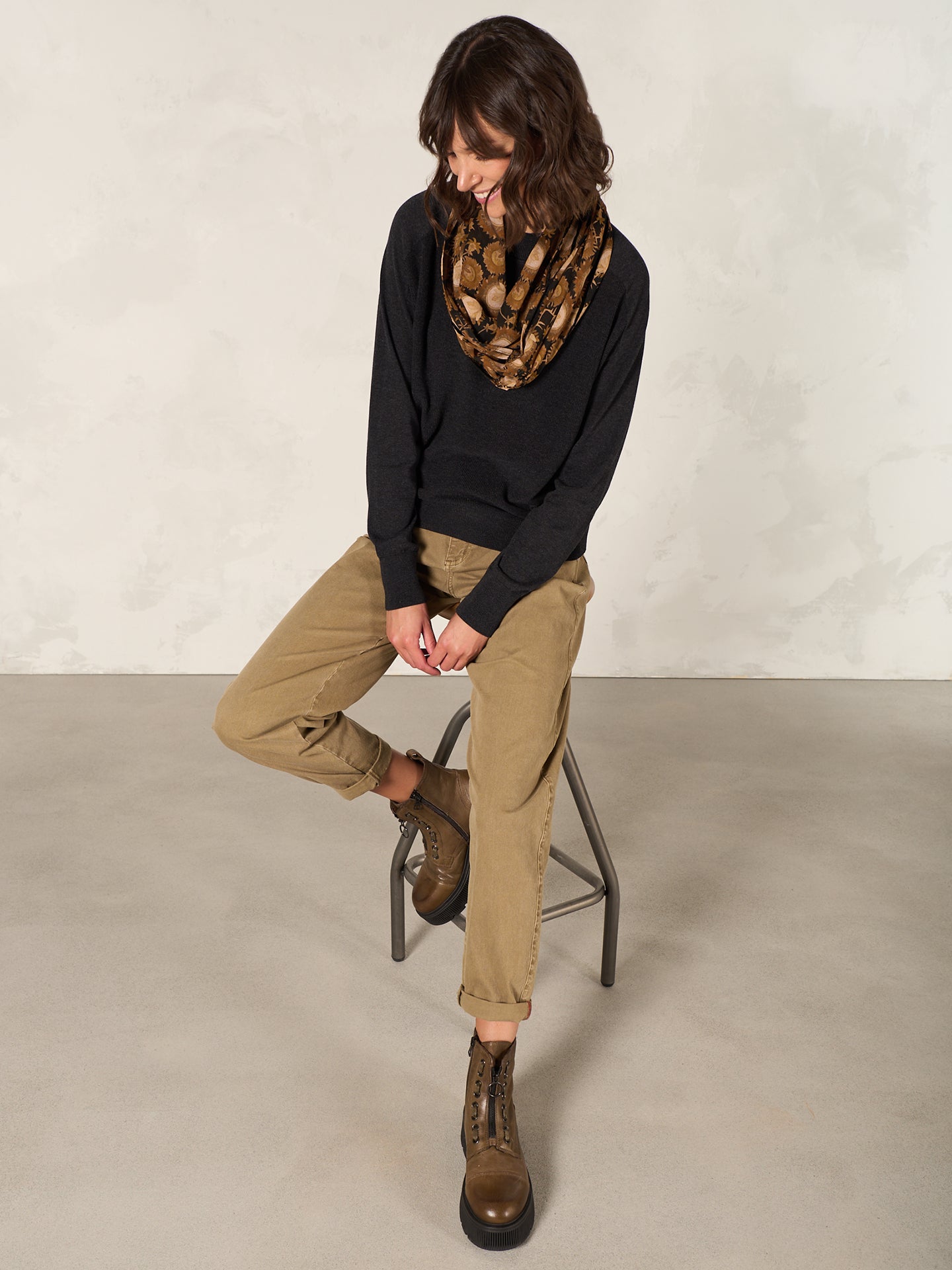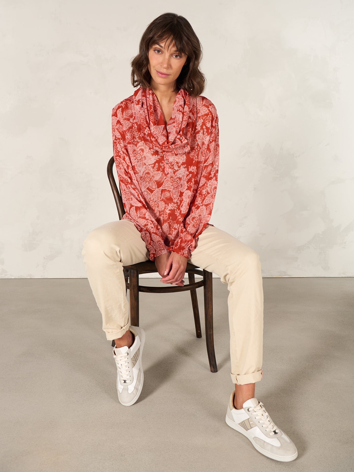 Fliessender Loopschal mit Spitzendetails, Knöpfen und Alloverprint. Aus 100% Eco Viskose, die aus nachhaltiger Holzwirtschaft gewonnen wird.