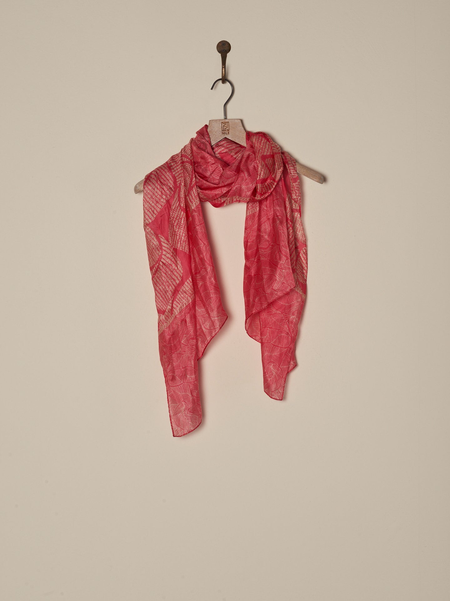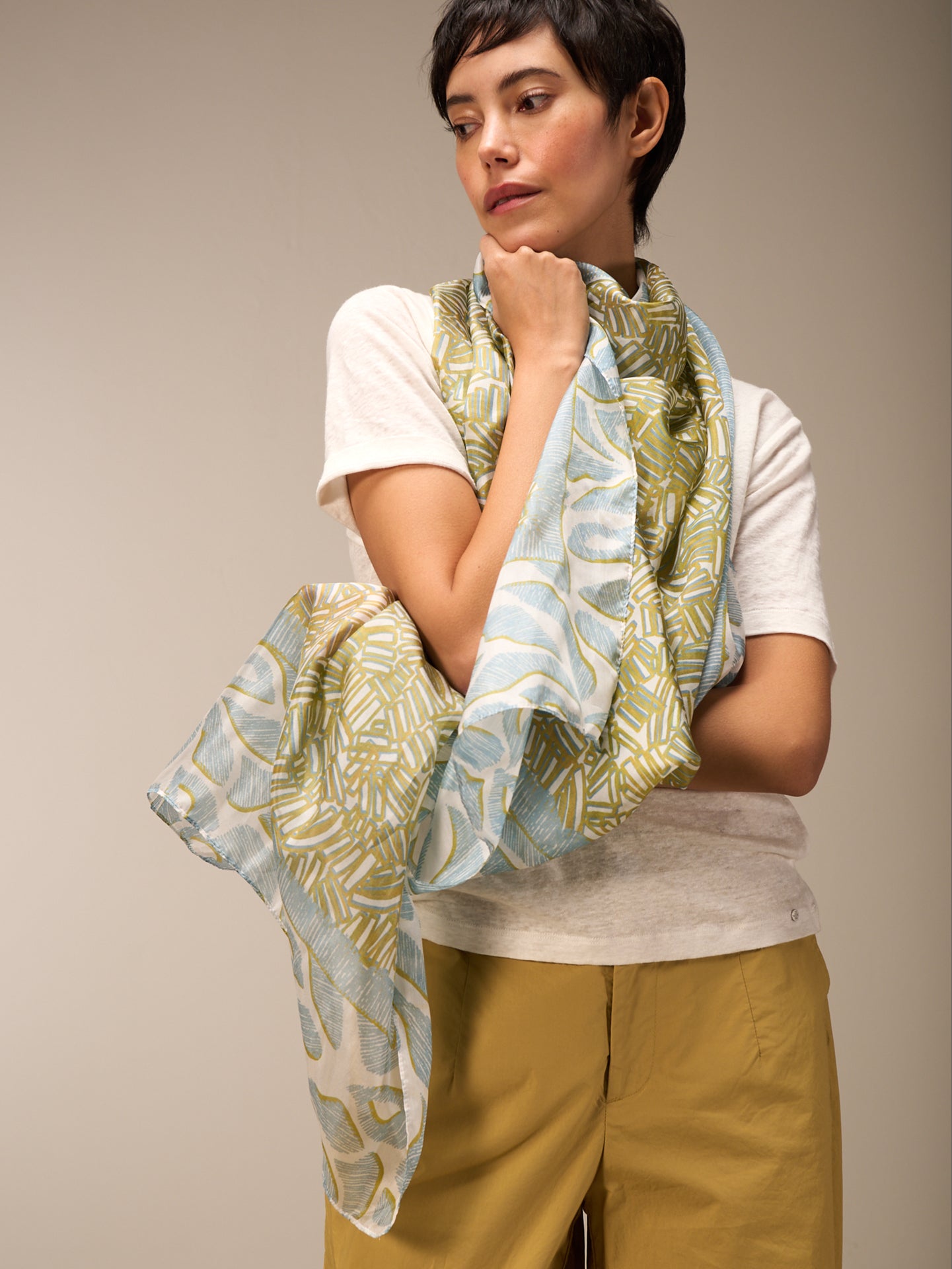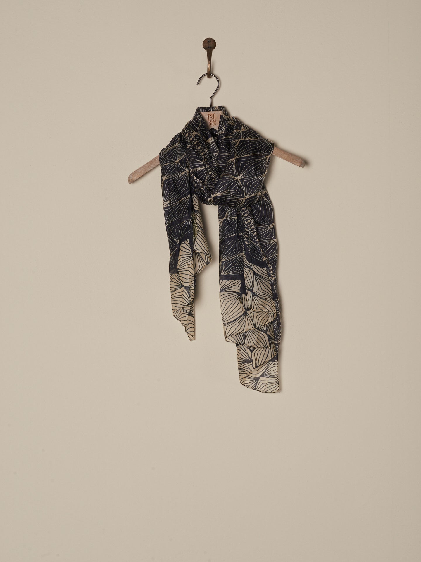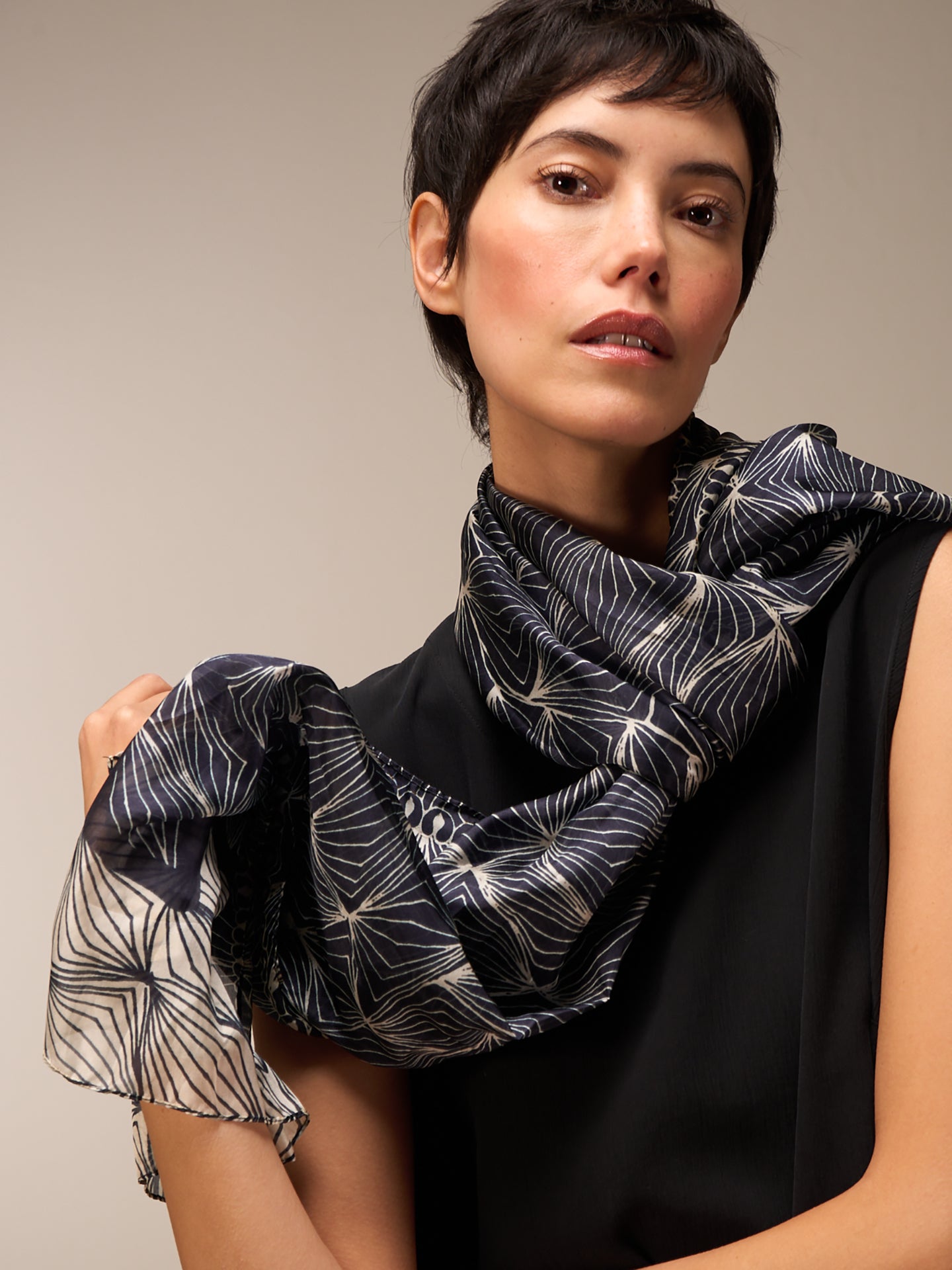 Schal mit handgezeichnetem Alloverprint in der Grösse 65x180cm. 100% Seide.