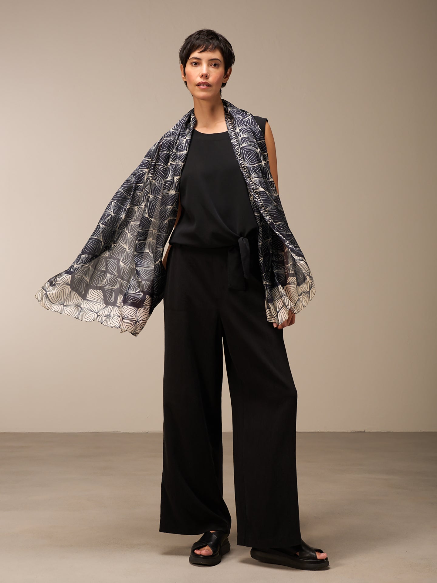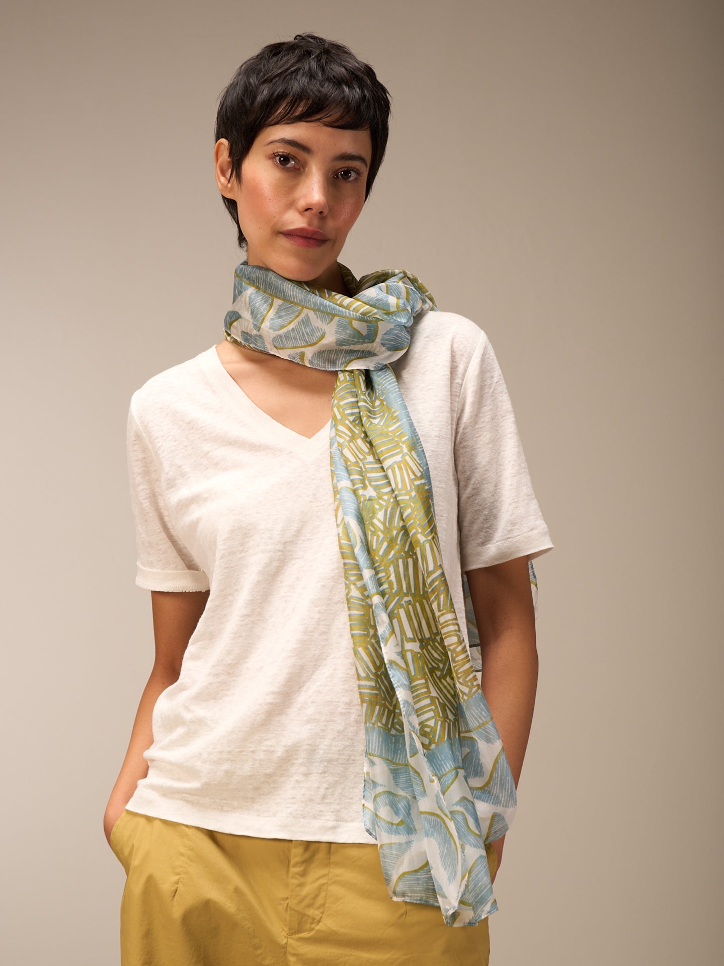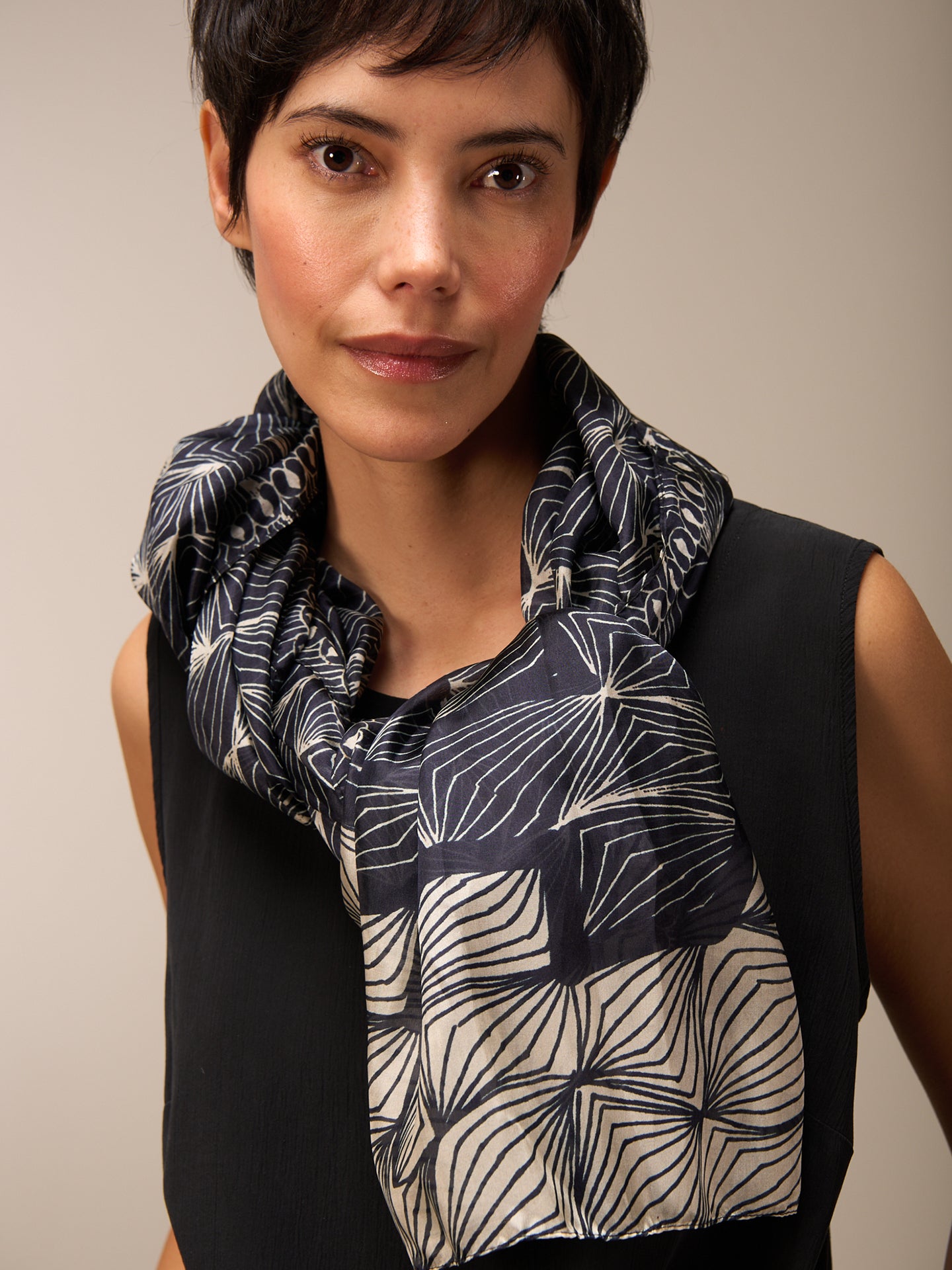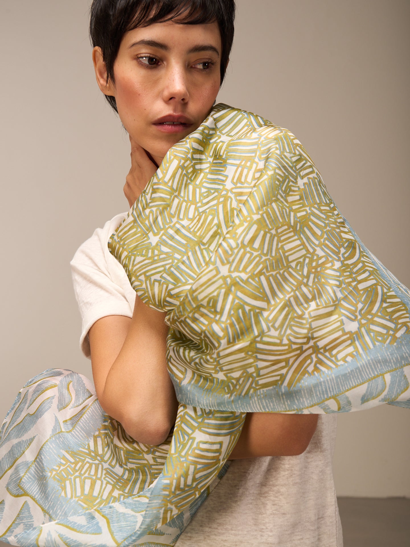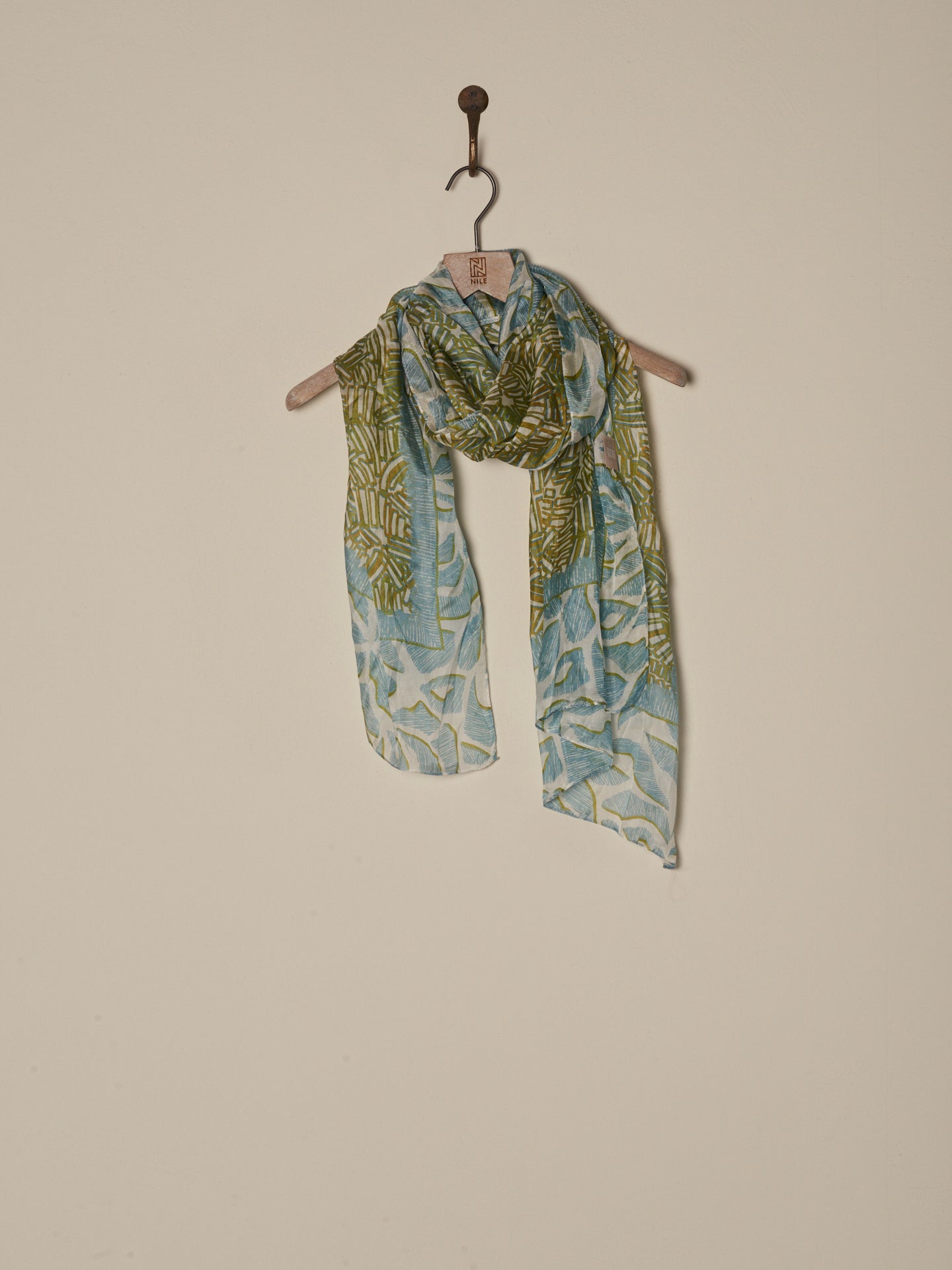 Schal mit handgezeichnetem Alloverprint in der Grösse 65x180cm. 100% Seide.