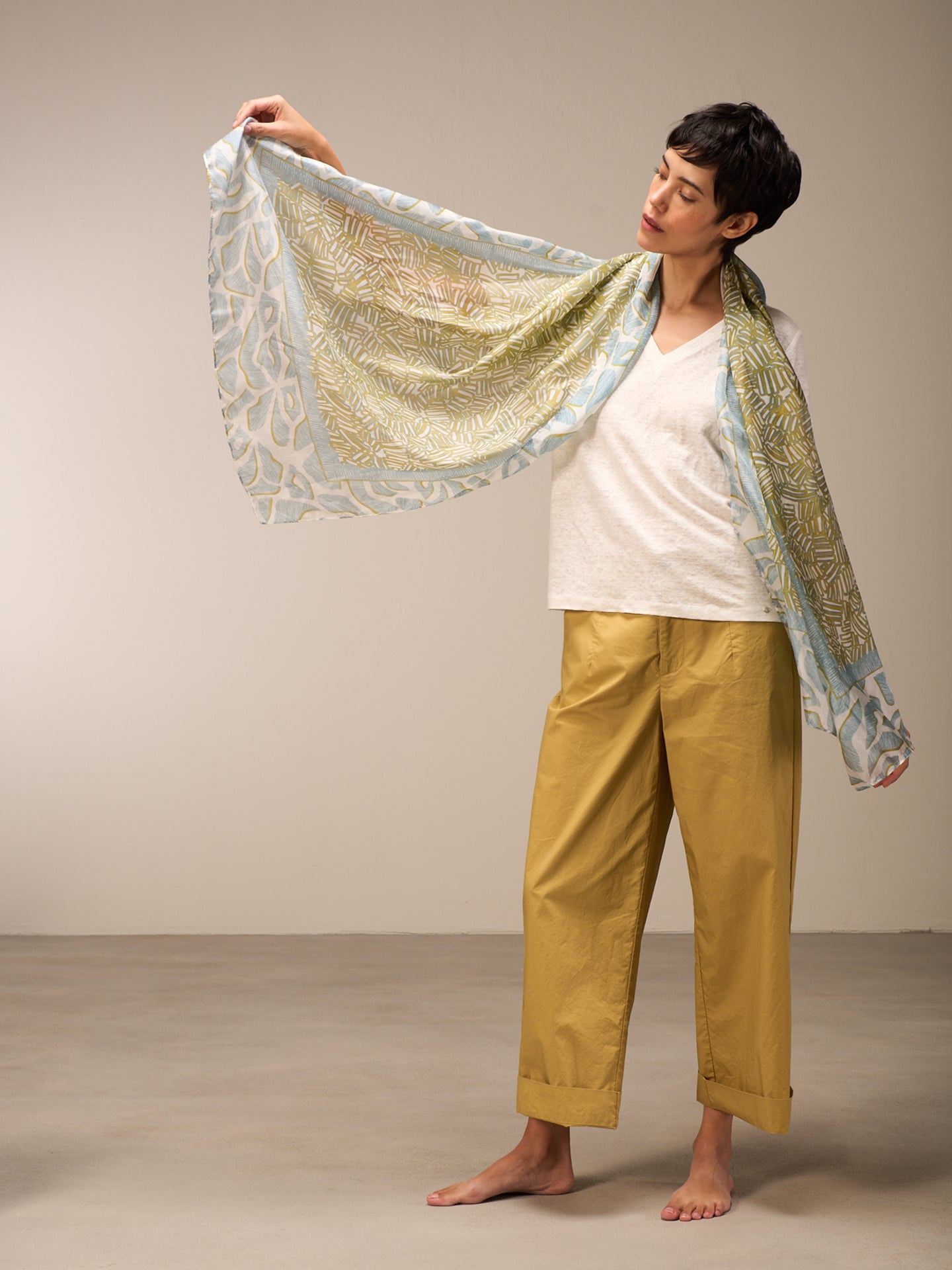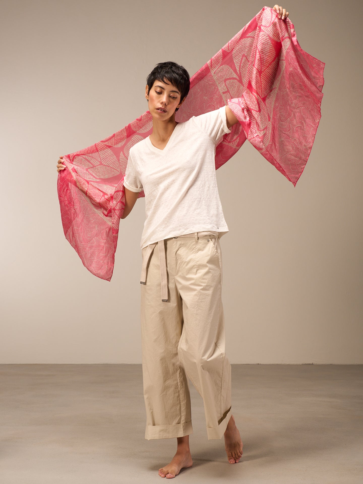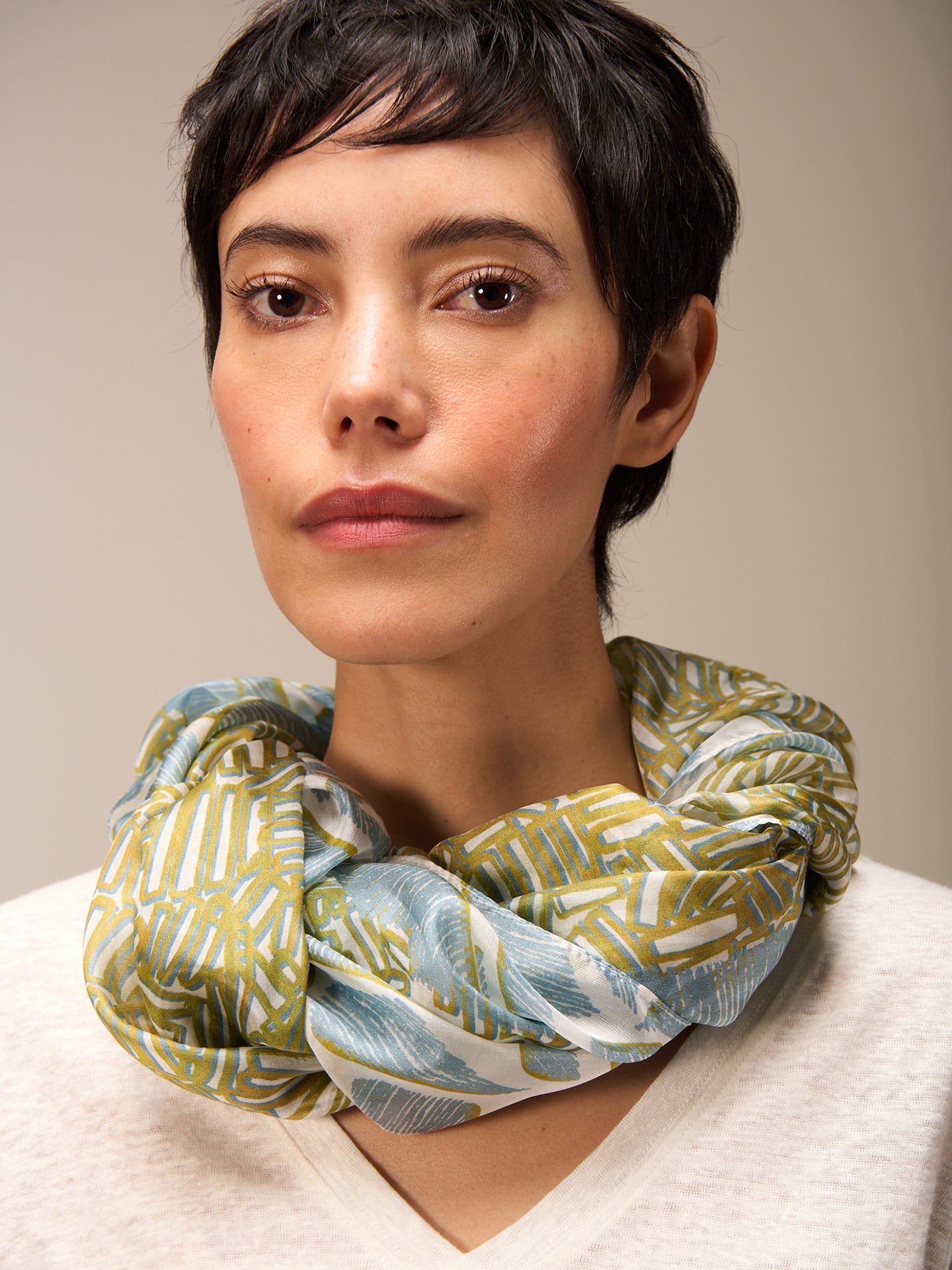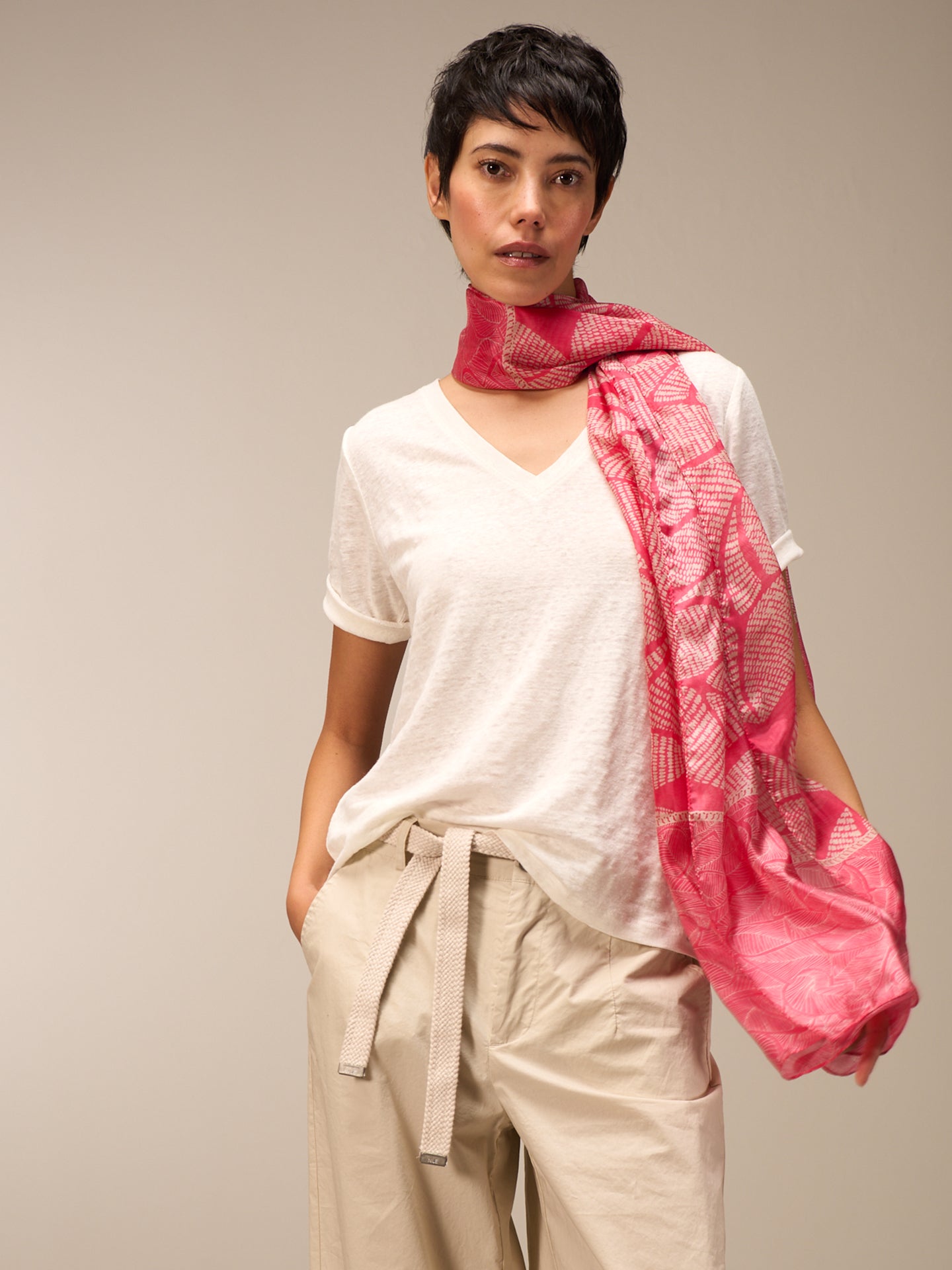 Schal mit handgezeichnetem Alloverprint in der Grösse 65x180cm. 100% Seide.