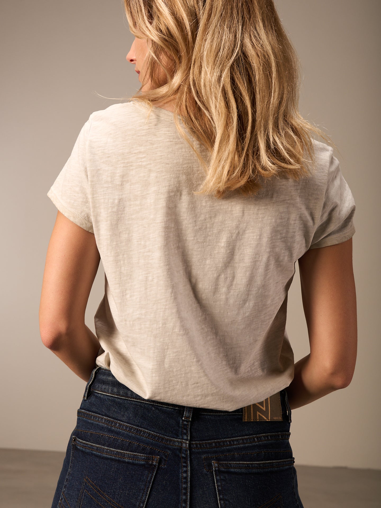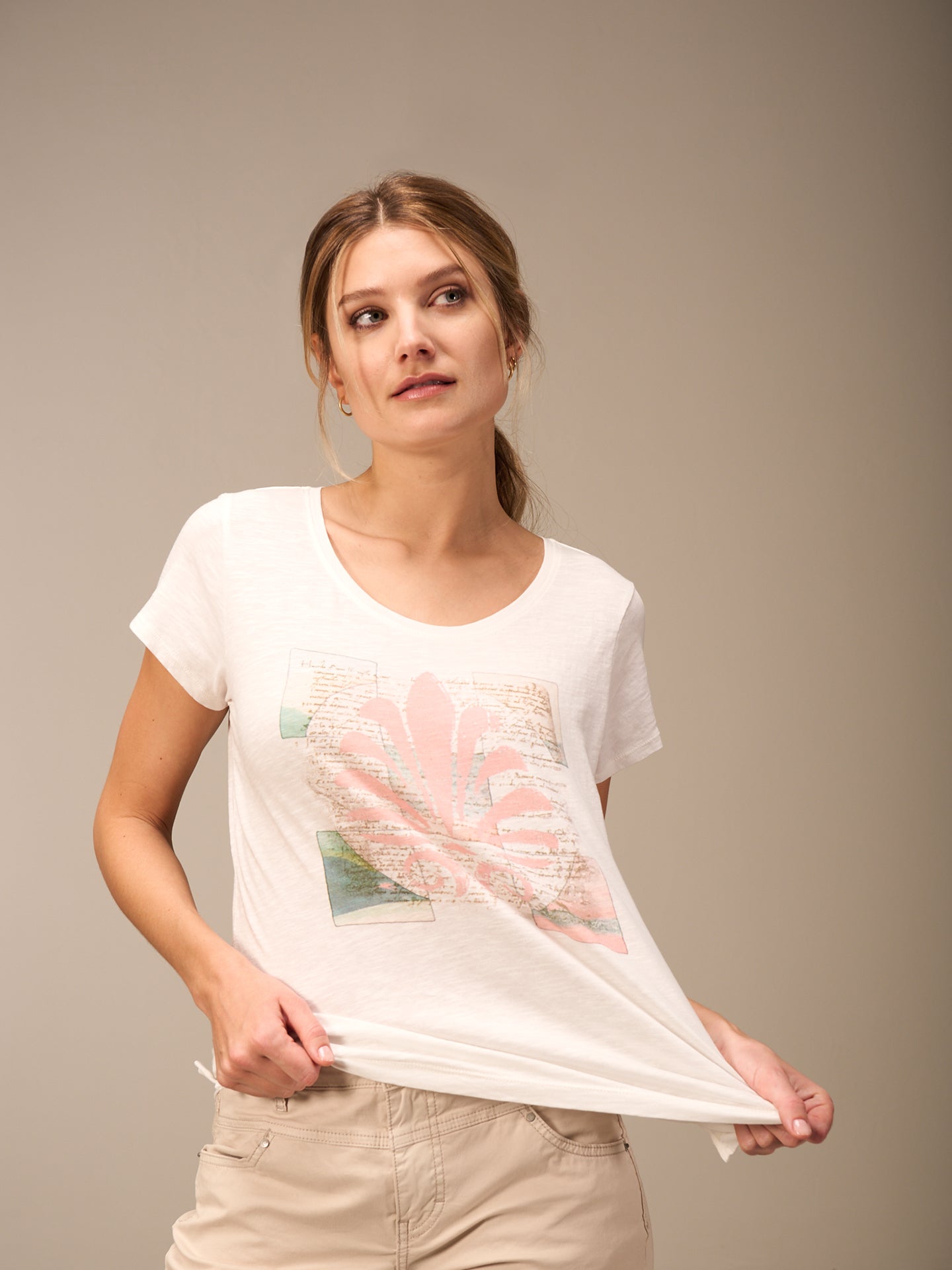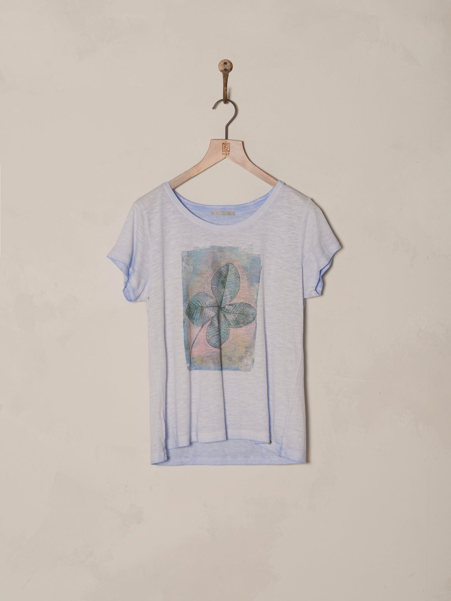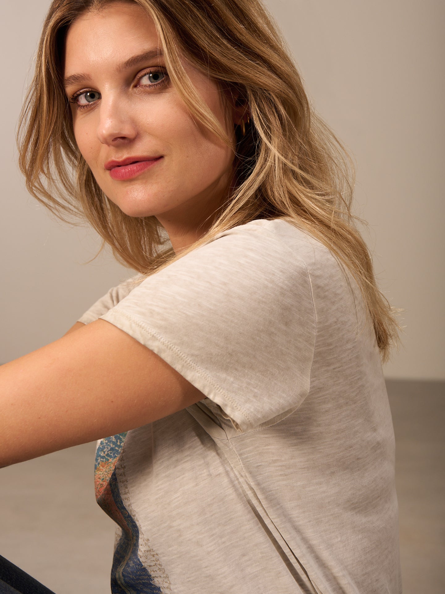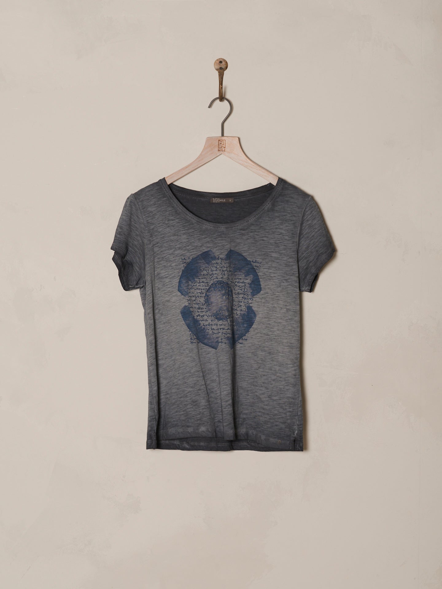 T-shirt mit platziertem Druck. 100% GOTS-zertifizierte Bio-Baumwollqualität. Durch ein spezielles inwendiges Färbeverfahren erhält das Shirt einen schönen ausgewaschenen Look. Unregelmässigkeiten in der Farbe machen das Stück einzigartig. Der Ausbleicheffekt wird verstärkt.