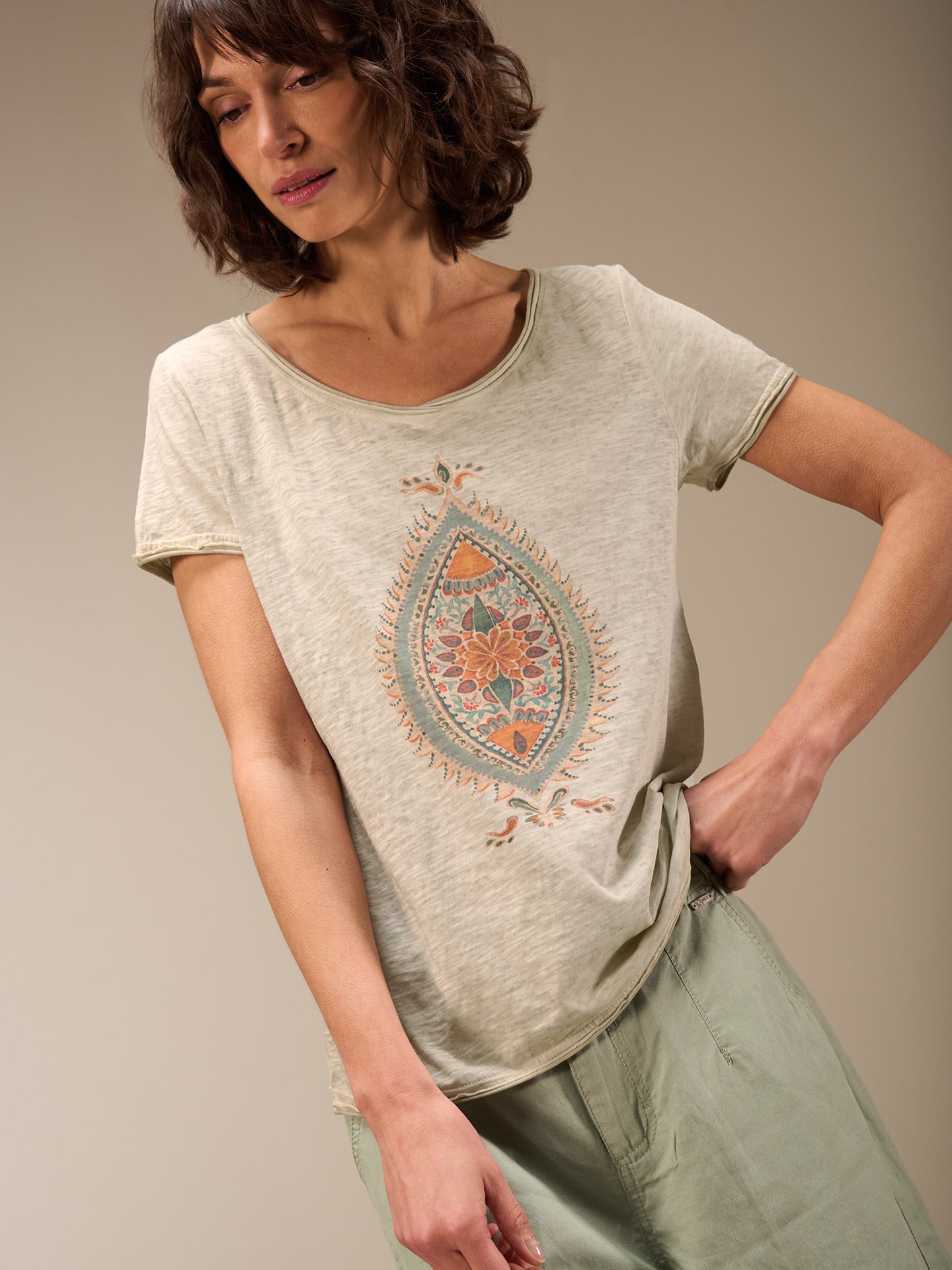 Locker geschnittenes T-shirt aus geflammtem Jersey mit platziertem Druck und offenkantigem V-Ausschnitt. 100% GOTS-zertifizierte Bio-Baumwollqualität. Durch ein spezielles inwendiges Färbeverfahren erhält das Shirt einen schönen ausgewaschenen Look. Unregelmässigkeiten in der Farbe machen das Stück einzigartig. Der Ausbleicheffekt wird verstärkt.