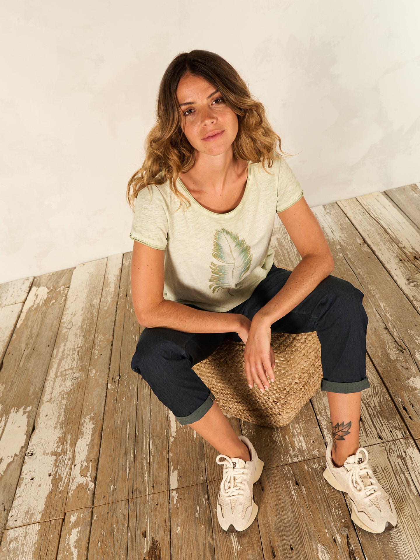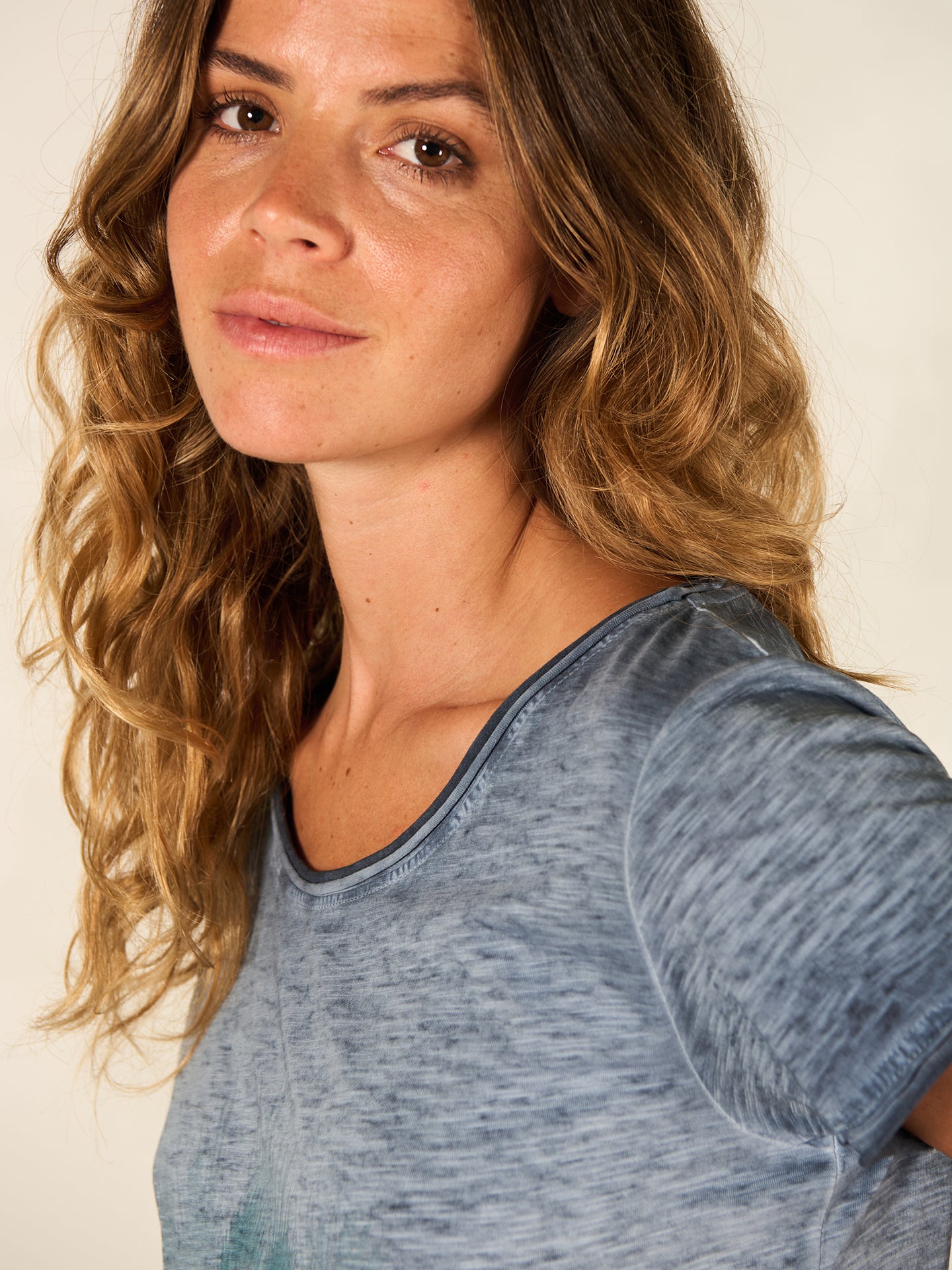 Locker geschnittenes T-Shirt aus geflammtem Jersey mit platziertem Druck und offenkantigem Rundhalsausschnitt. 100% GOTS-zertifizierte Bio-Baumwollqualität. Durch ein spezielles inwendiges Färbeverfahren erhält das Shirt einen schönen ausgewaschenen Look. Unregelmässigkeiten in der Farbe machen das Stück einzigartig. Der Ausbleicheffekt wird beim Waschen verstärkt.
