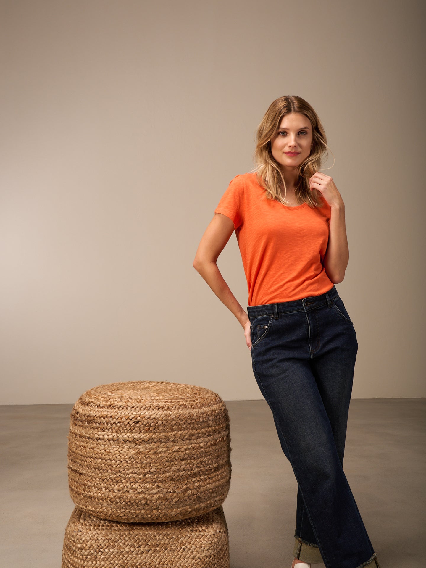 Locker geschnittenes T-Shirt mit Rundhals, stückgefärbt, das Produkt kann auf Kleidung und Oberflächen abfärben. Aus 70% OCS-zertifizierter Bio-Baumwolle. Der Organic Content Standard (OCS) überprüft den Anteil an biologisch angebauten Materialien in einem Endprodukt und stellt durch lückenlose Rückverfolgbarkeit sicher, dass die Angaben zum biologischen Materialanteil korrekt sind.