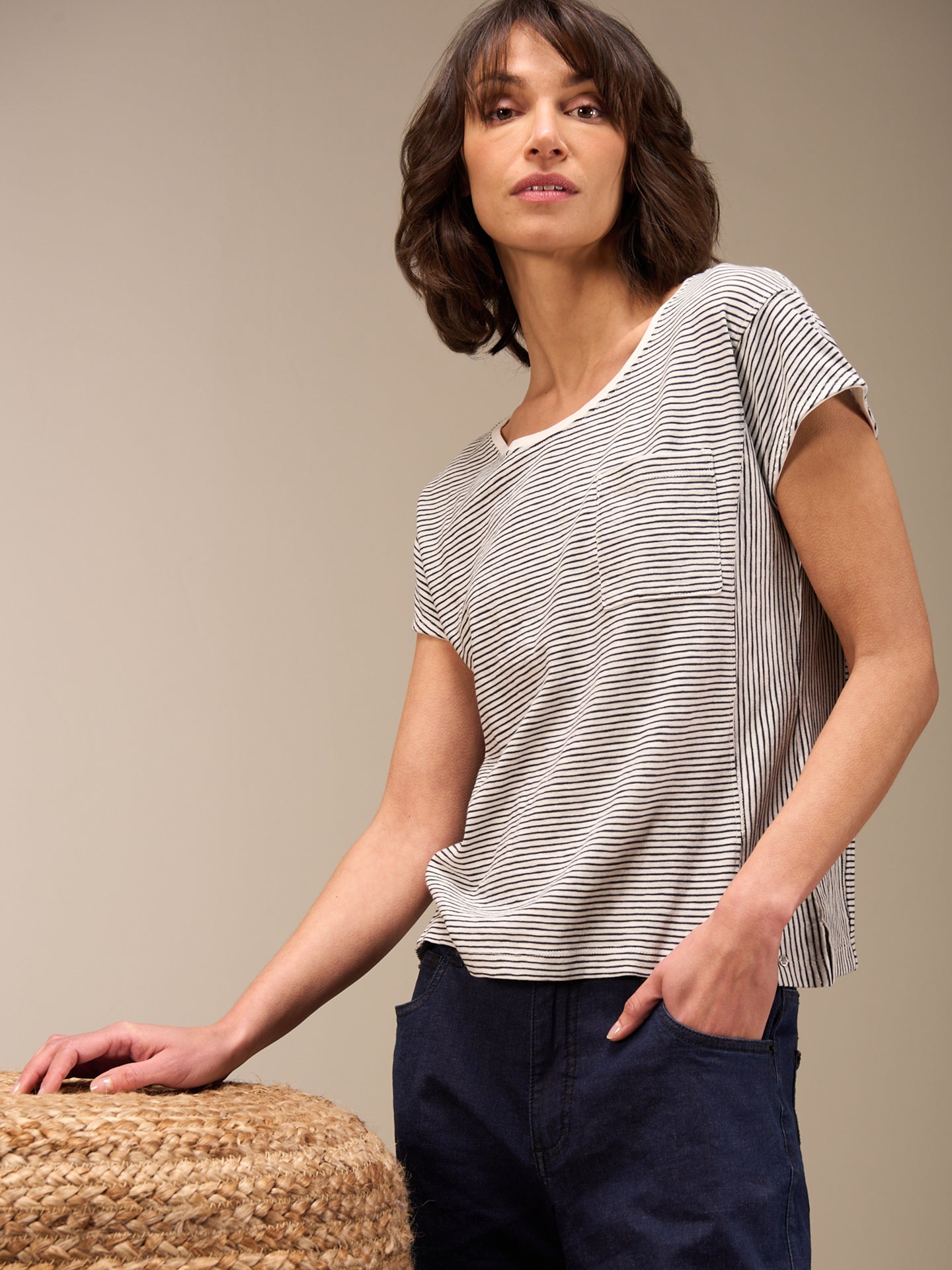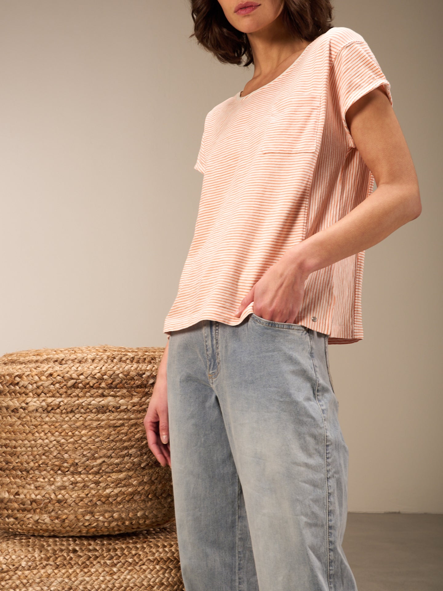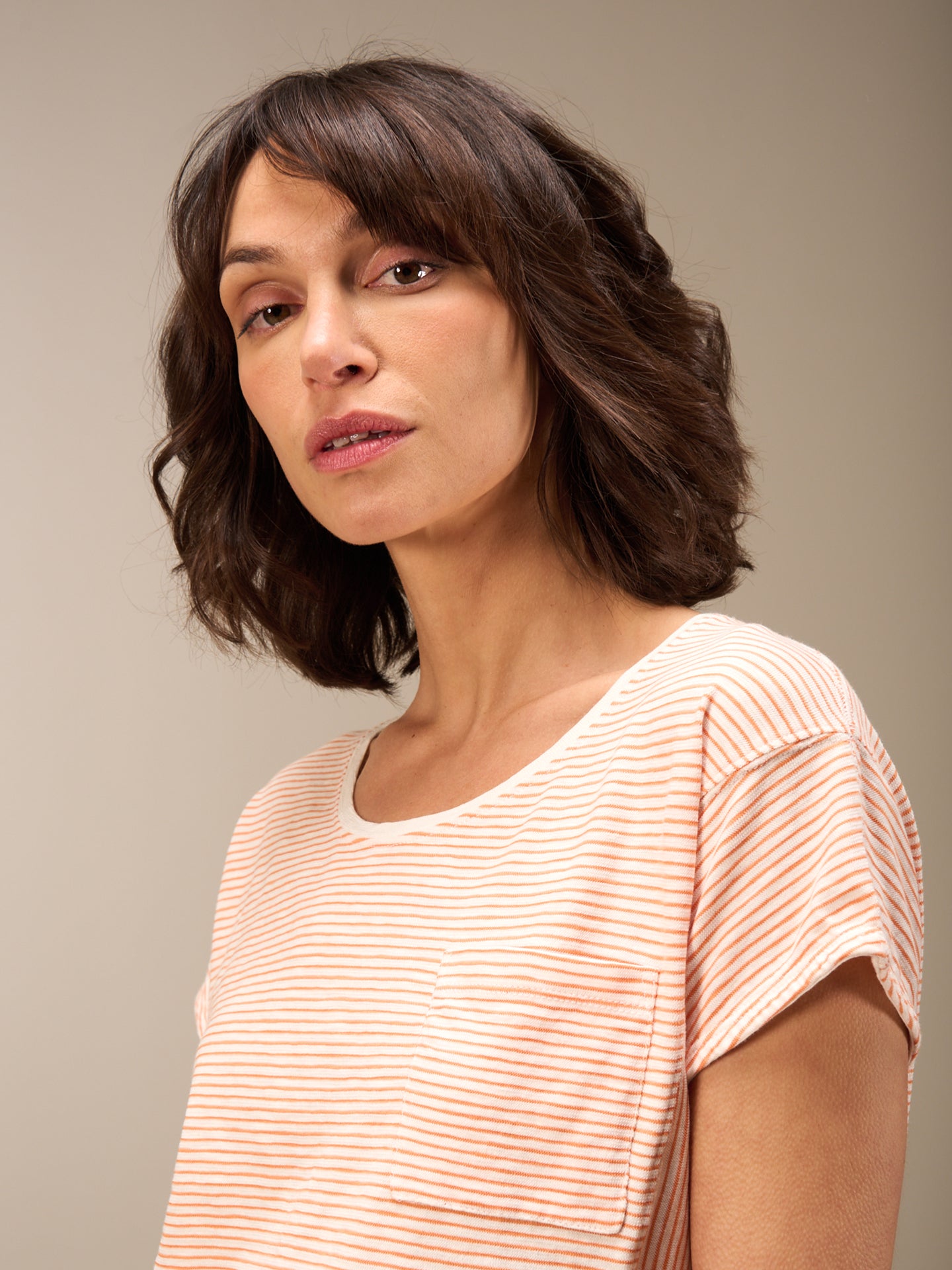 Lässiges Kurzarmshirt mit Rundhals, seitlich geschlitzt, in gestricktem Streifenmuster mit einer dekorativen kleinen Brusttasche. 100% GOTS-zertifizierte Bio-Baumwollqualität.