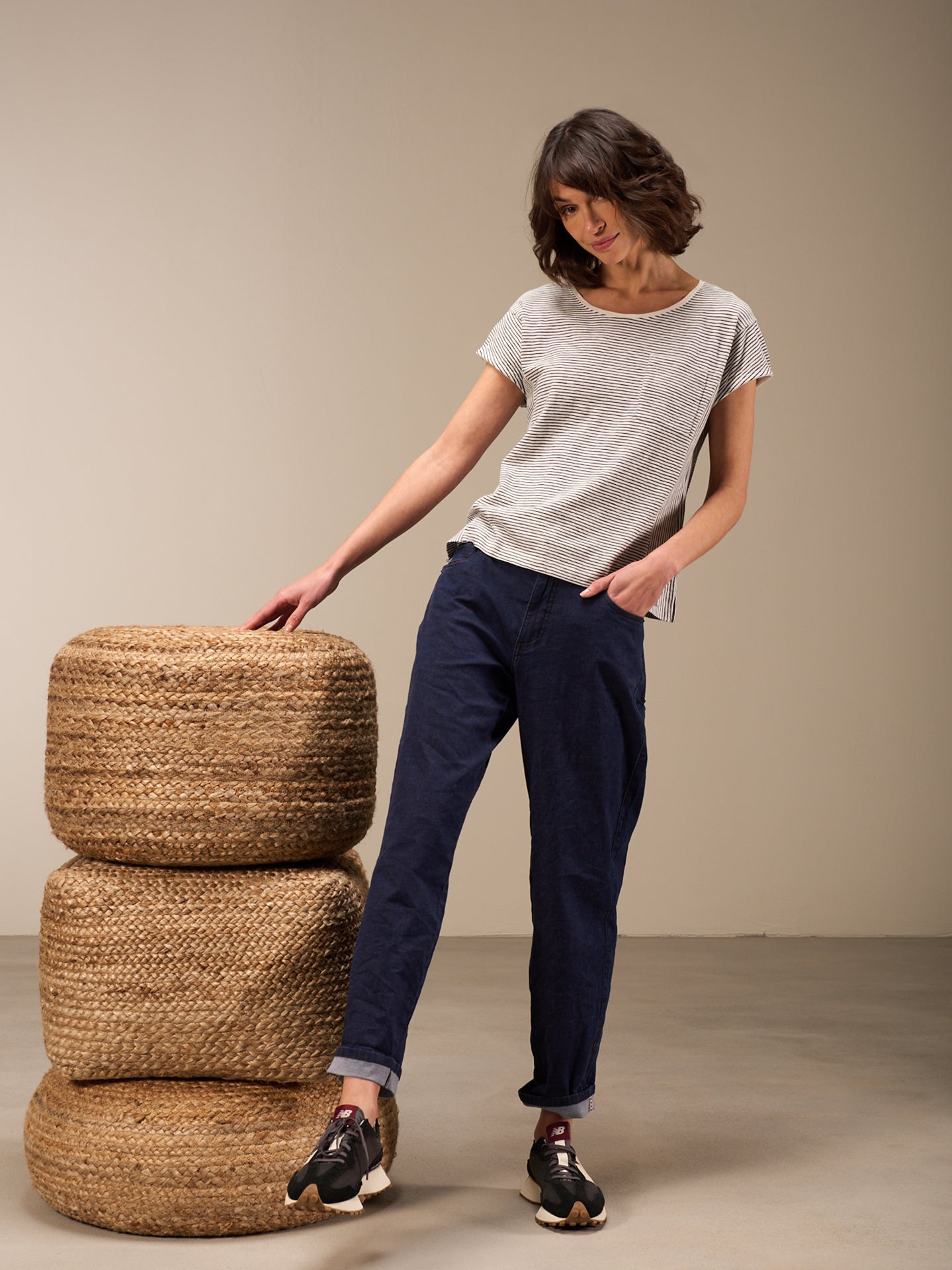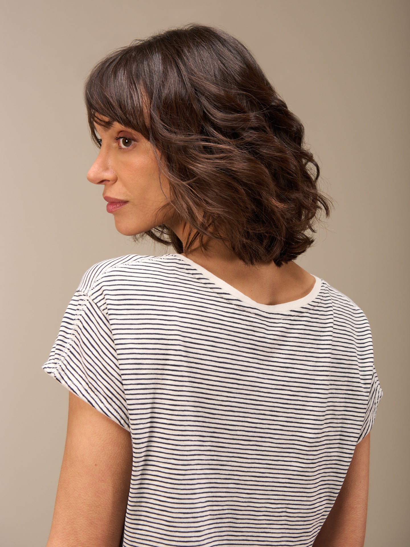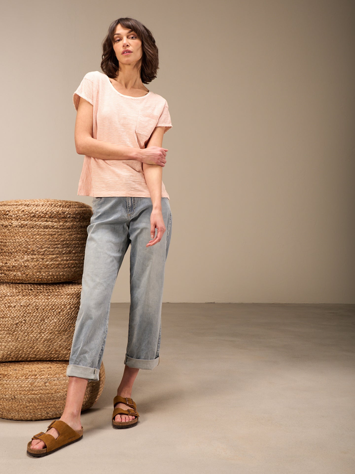 Lässiges Kurzarmshirt mit Rundhals, seitlich geschlitzt, in gestricktem Streifenmuster mit einer dekorativen kleinen Brusttasche. 100% GOTS-zertifizierte Bio-Baumwollqualität.