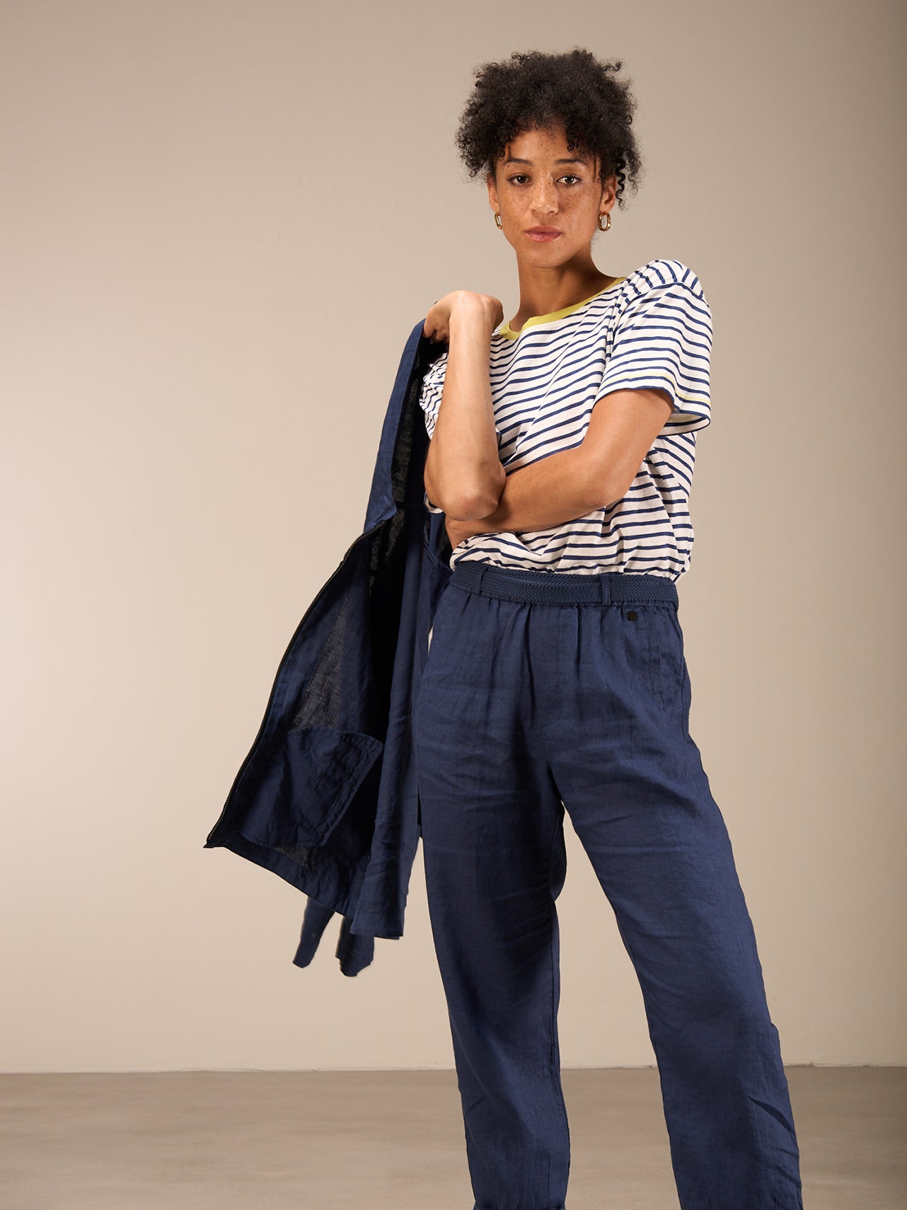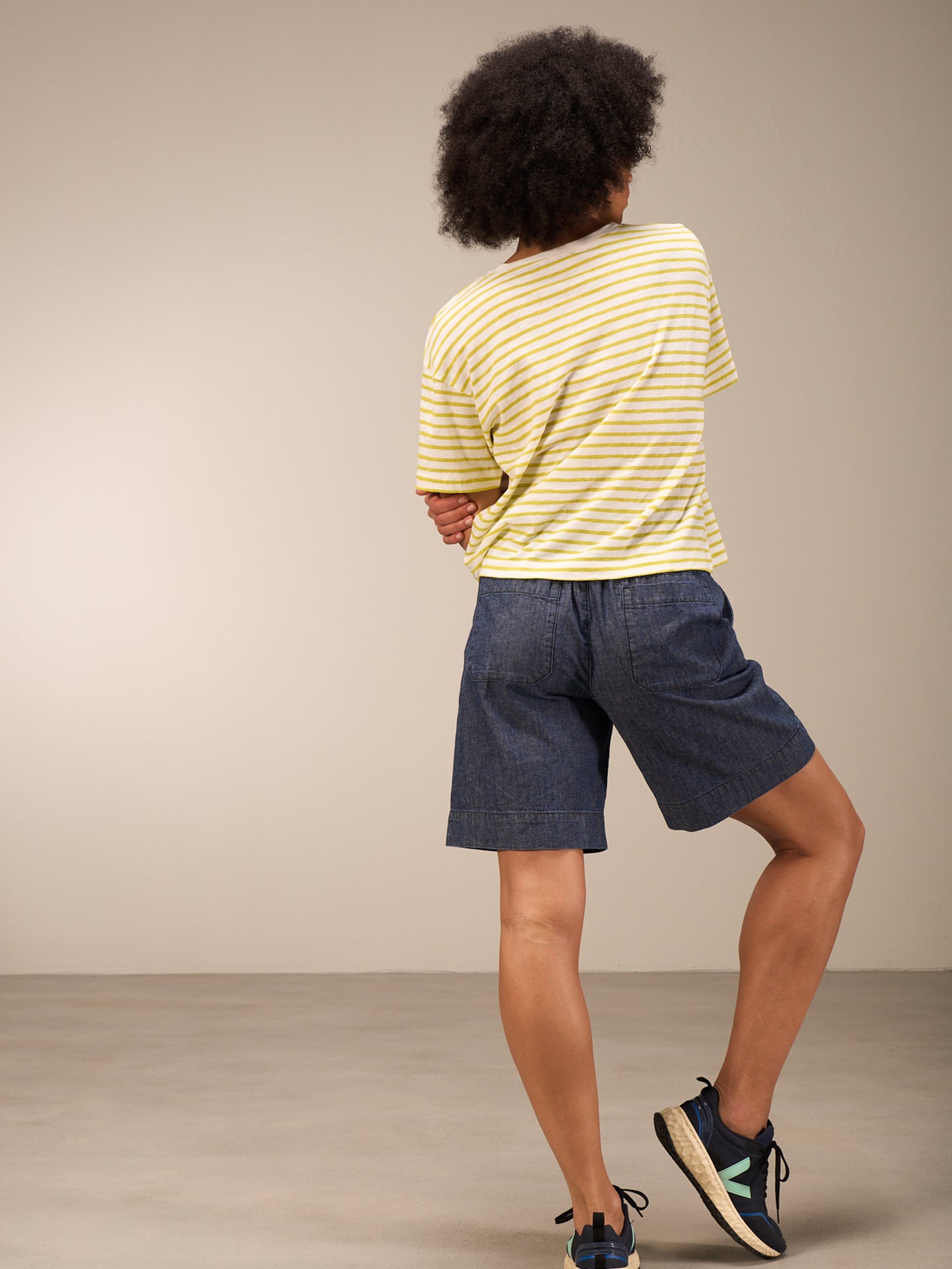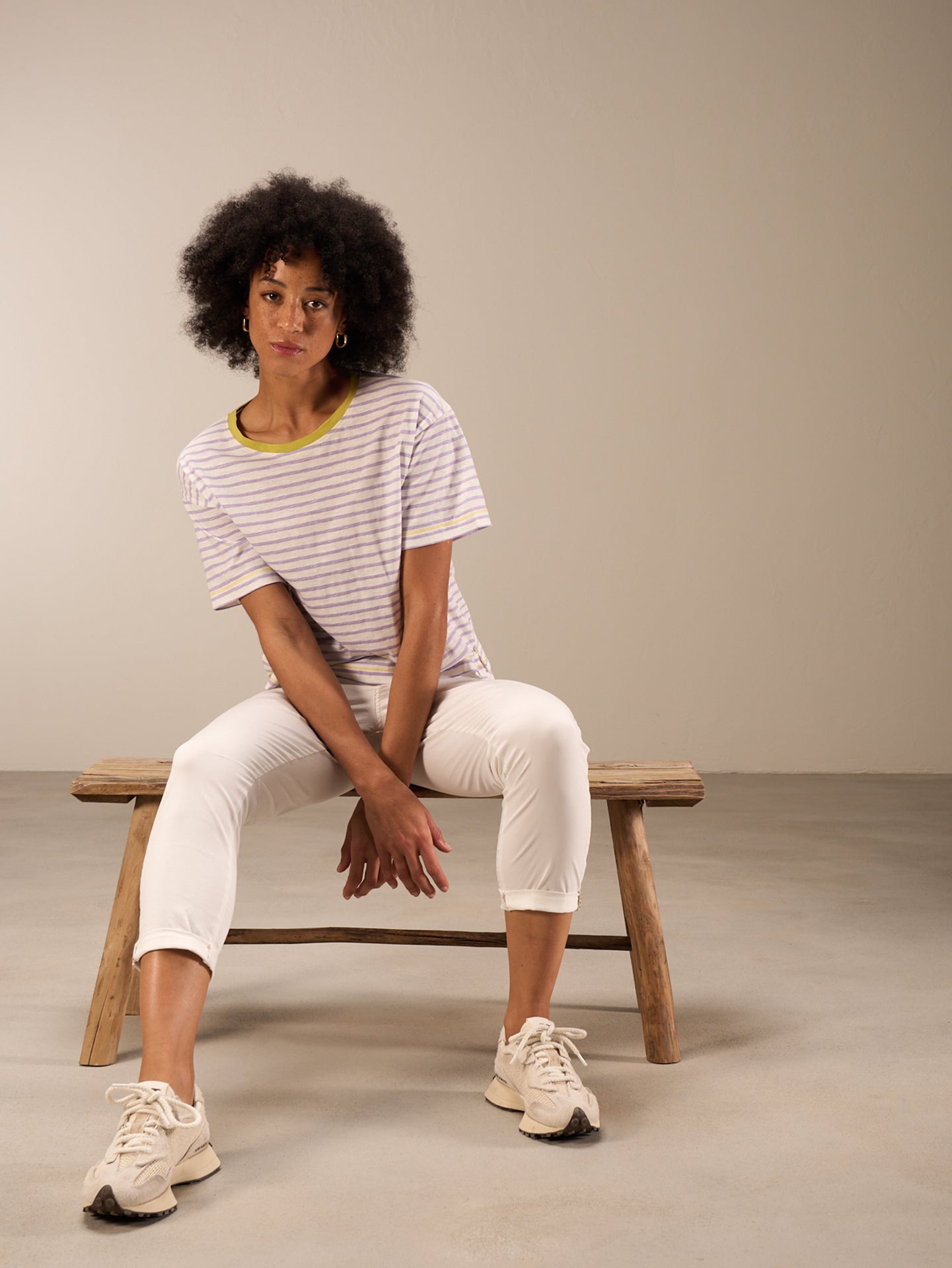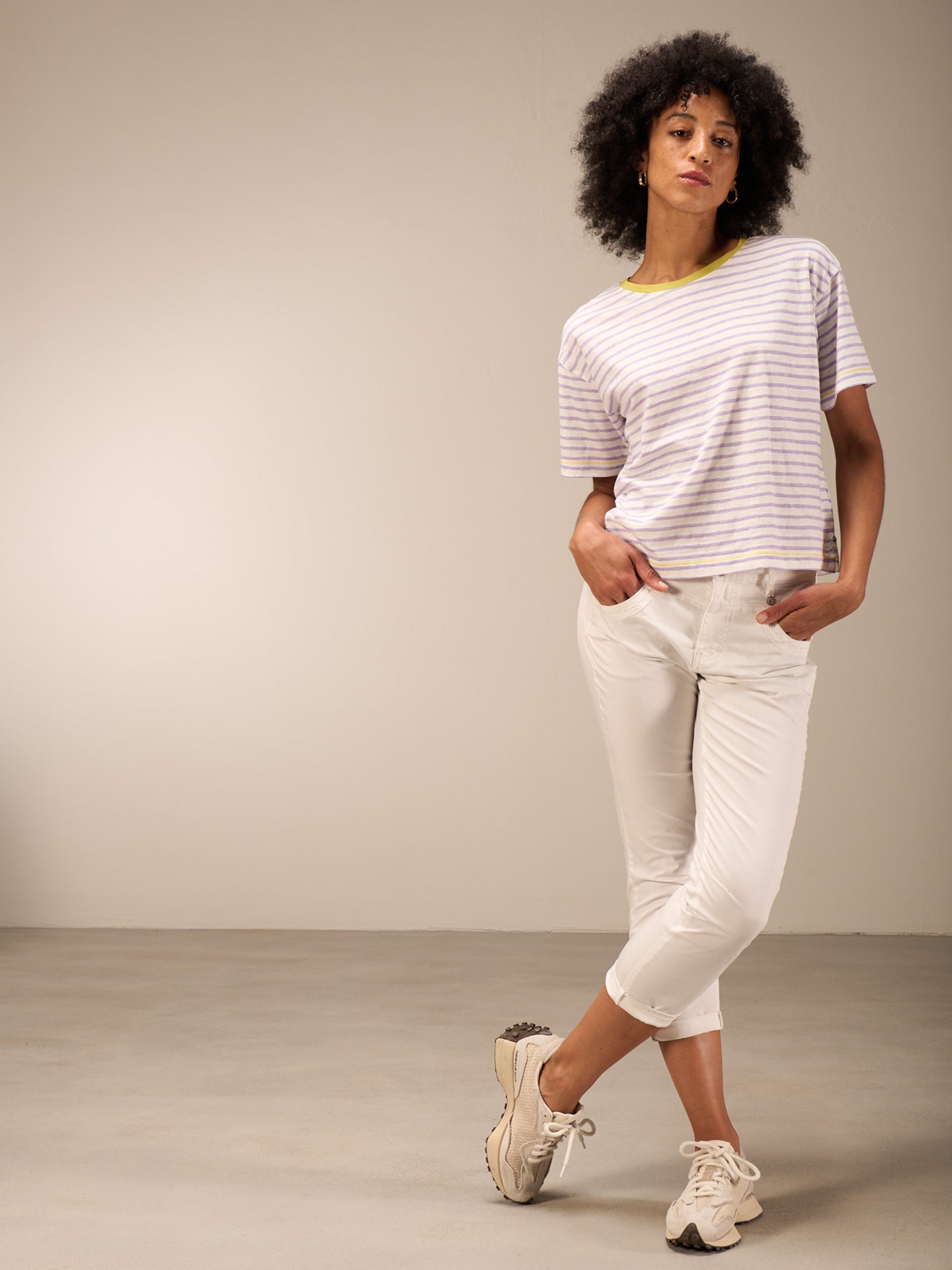Angesagtes Kurzarmshirt in verkürzter kastiger Form und modischem Rundhalsausschnitt. Der geflammte Jersey und der ganzflächigem Streifendruck machen das Shirt zu einem beliebten Sommerbegleiter.