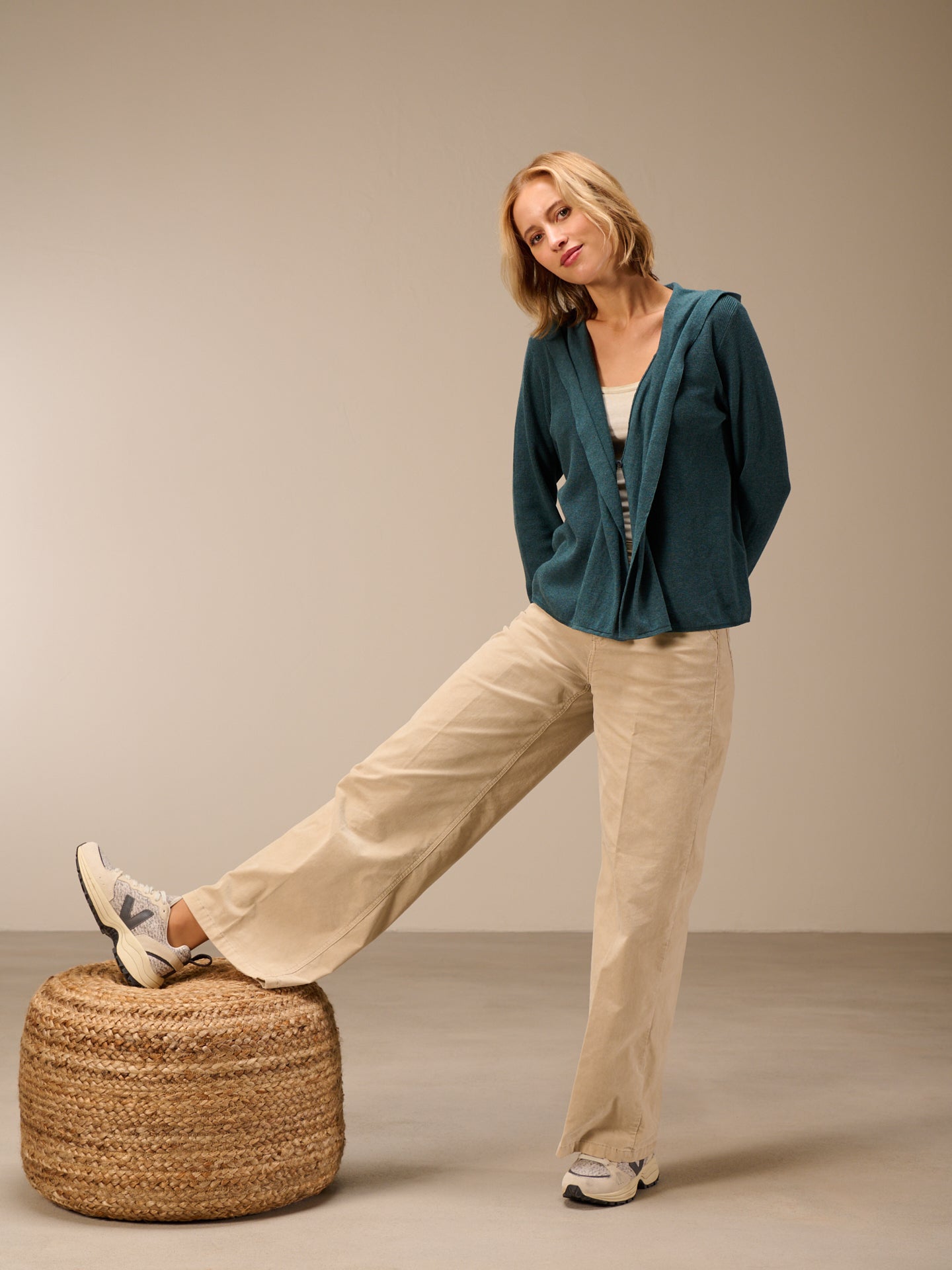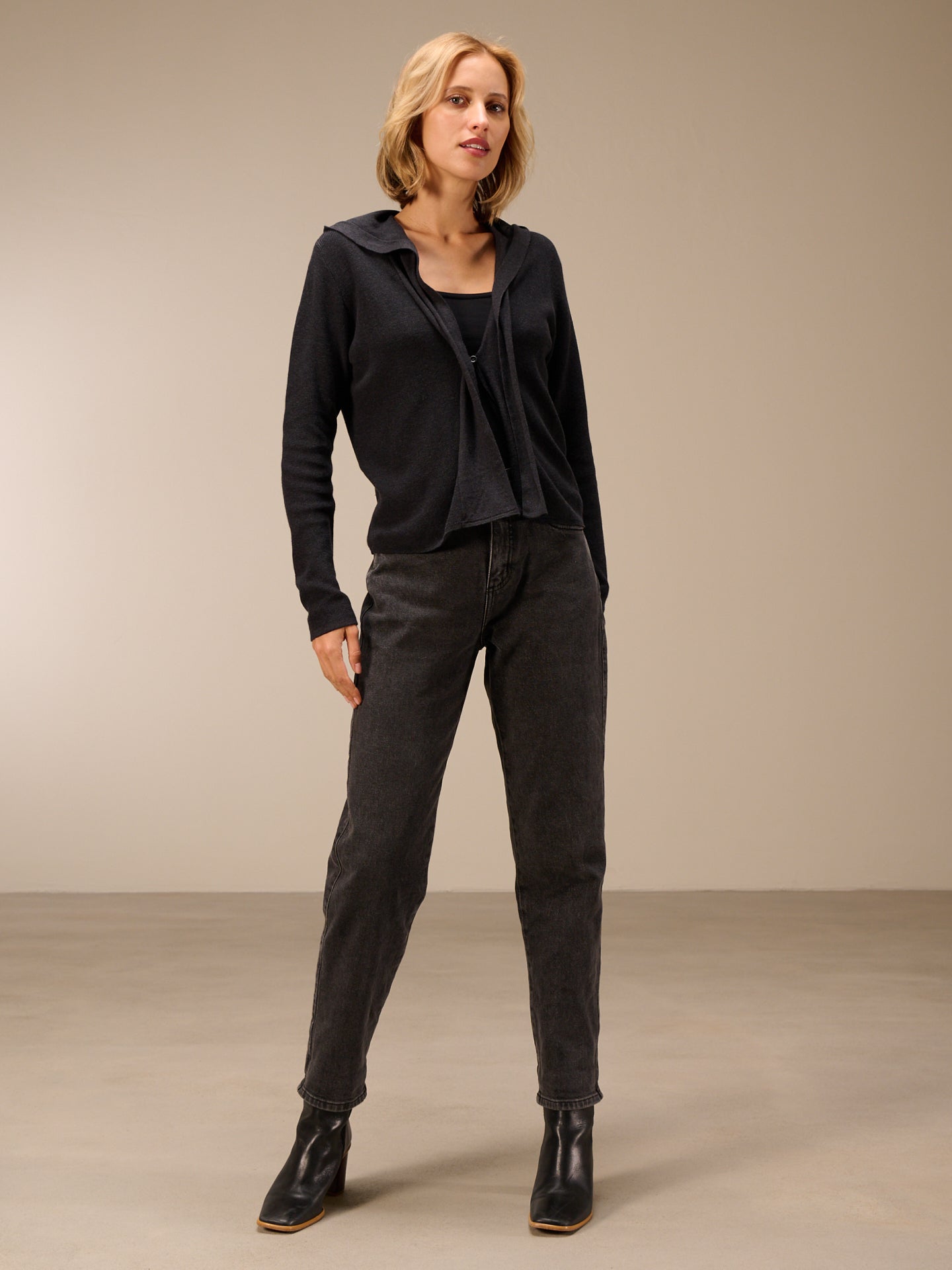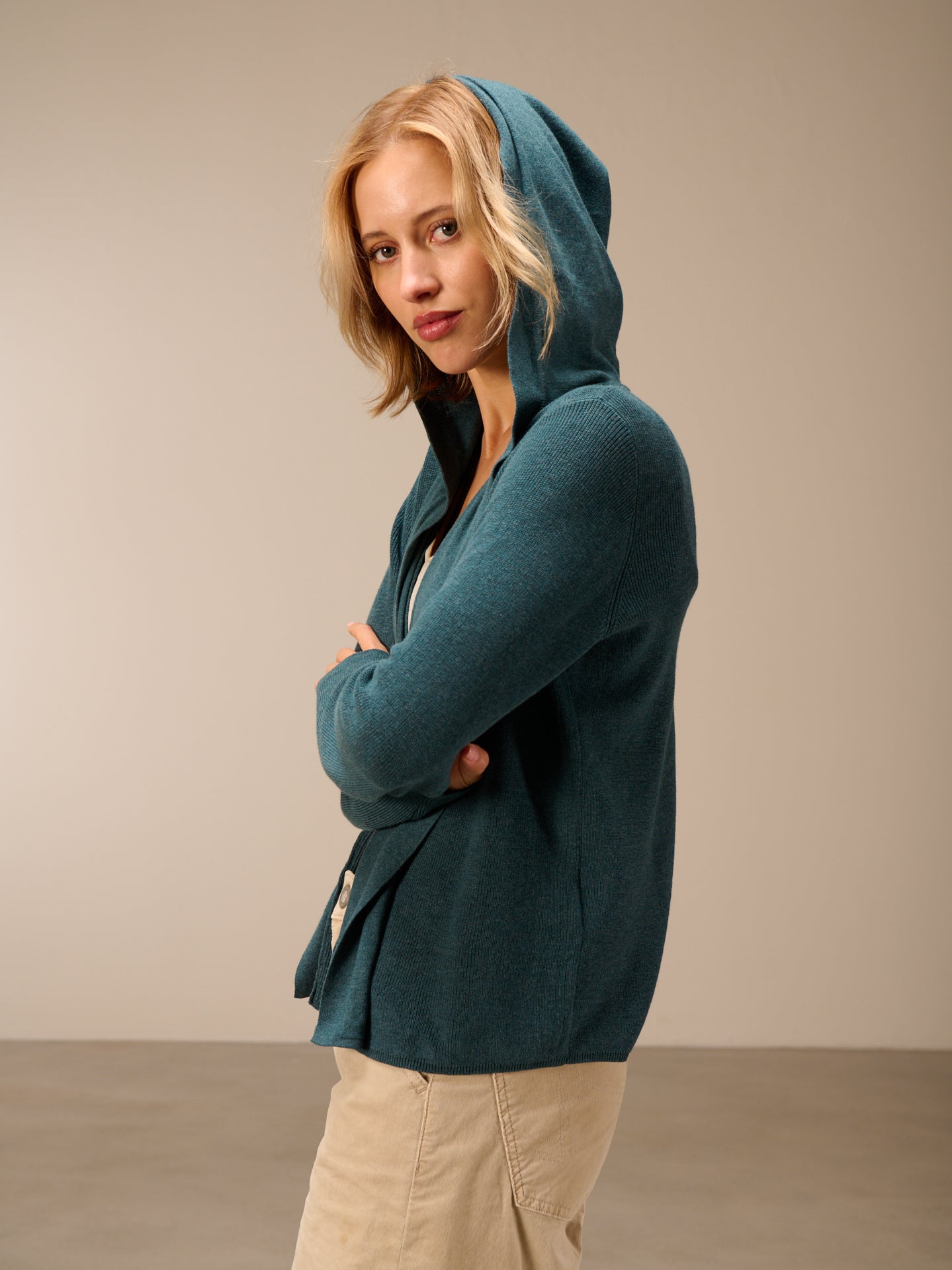 Locker geschnittene Strickjacke im Halb-Patentmuster gestrickt, mit Kapuze mit Schalkragen.