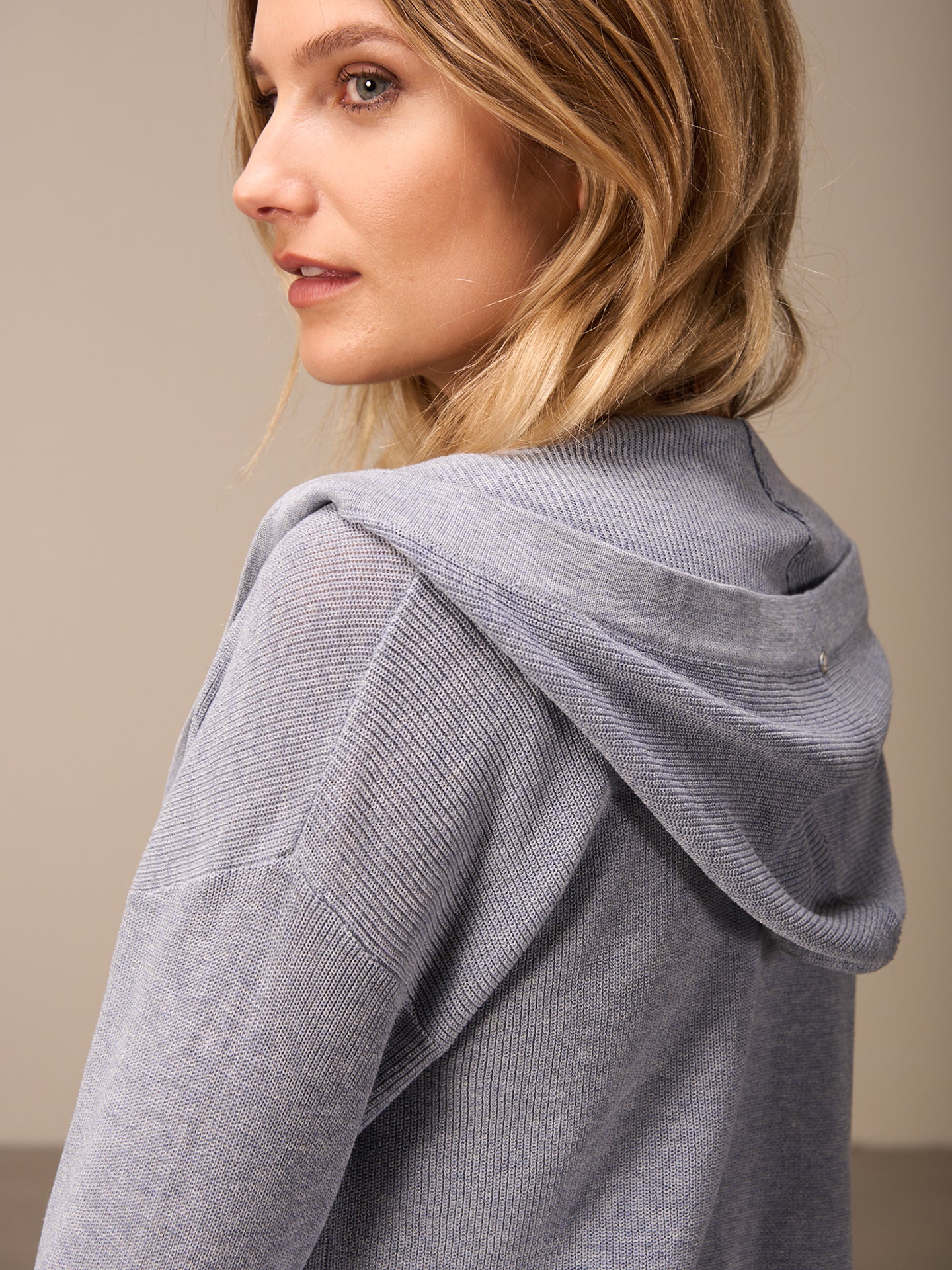 Mit Metalldruckknöpfen verschliessbare lockere Strickjacke mit überschnittener Schulter, Kapuze und Taschen mit seitlichem Eingriff. 60% Bio-Baumwolle aus OCS-zertifiziertem Anbau und 40% recyceltes Polyester. Der Organic Content Standard (OCS) überprüft den Anteil an biologisch angebauten Materialien in einem Endprodukt und stellt durch lückenlose Rückverfolgbarkeit sicher, dass die Angaben zum biologischen Materialanteil korrekt sind.