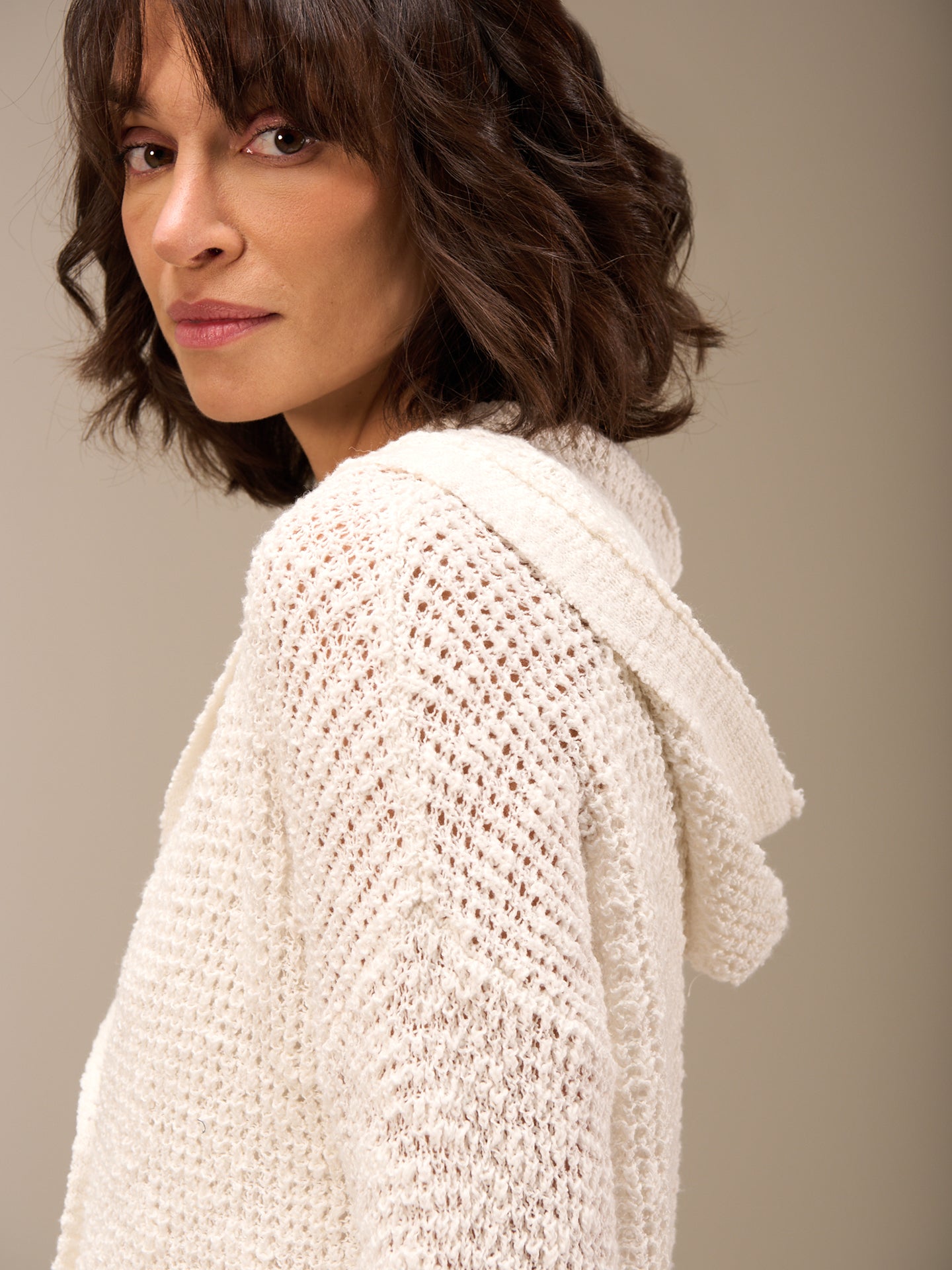 Lockere Strickjacke im Halbpatentmuster mit Kapuze und einem hochwertigen Metalldruckknopf. Das strukturierte Garn sorgt für eine spannende Optik. Für einen hohen Tragekomfort sorgt die 92% GOTS-zertifizierte Bio-Baumwolle.