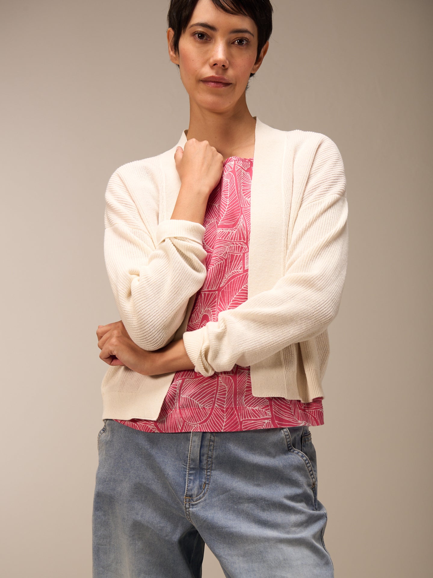 Locker geschnittene Strickjacke mit V-Ausschnitt und Rip-Borten an Ausschnitt und Ärmeln. Für einen hohen Tragekomfort sorgt die 55% Leinen- und 45% Baumwollequalität.