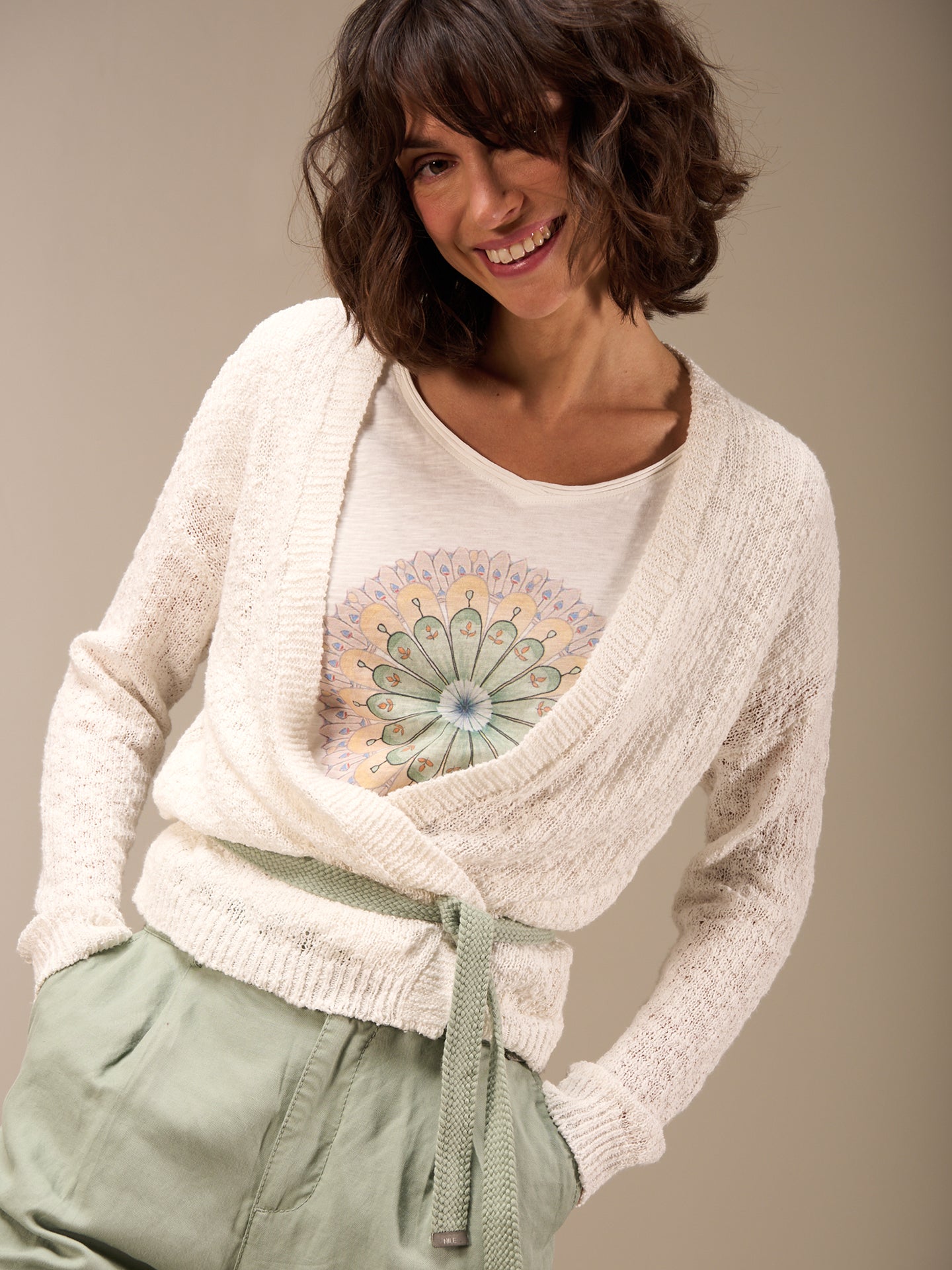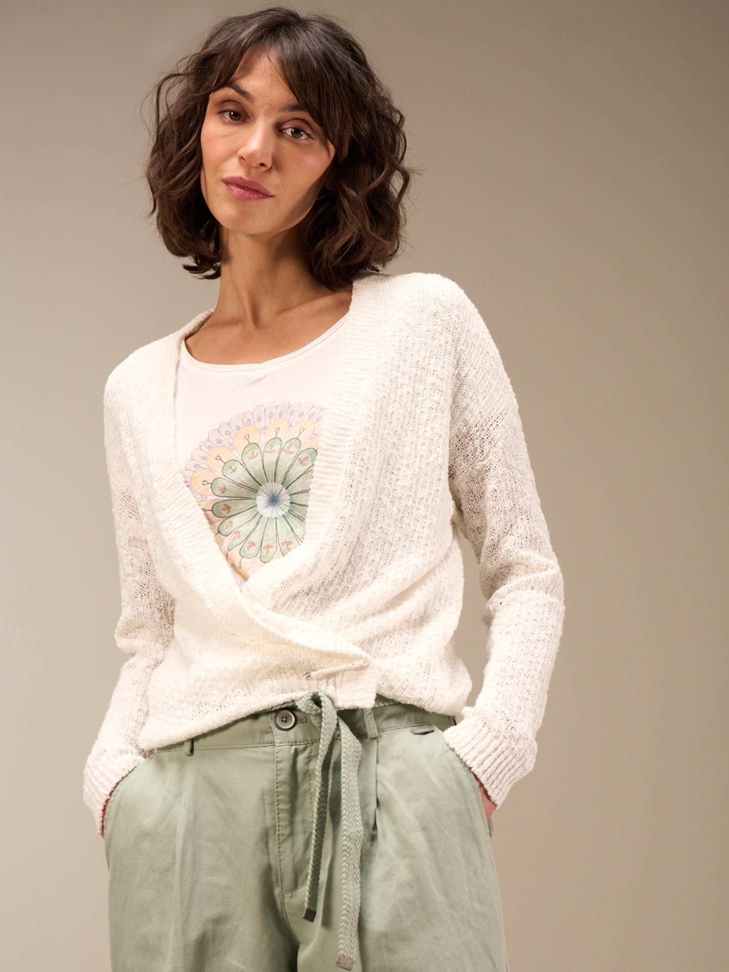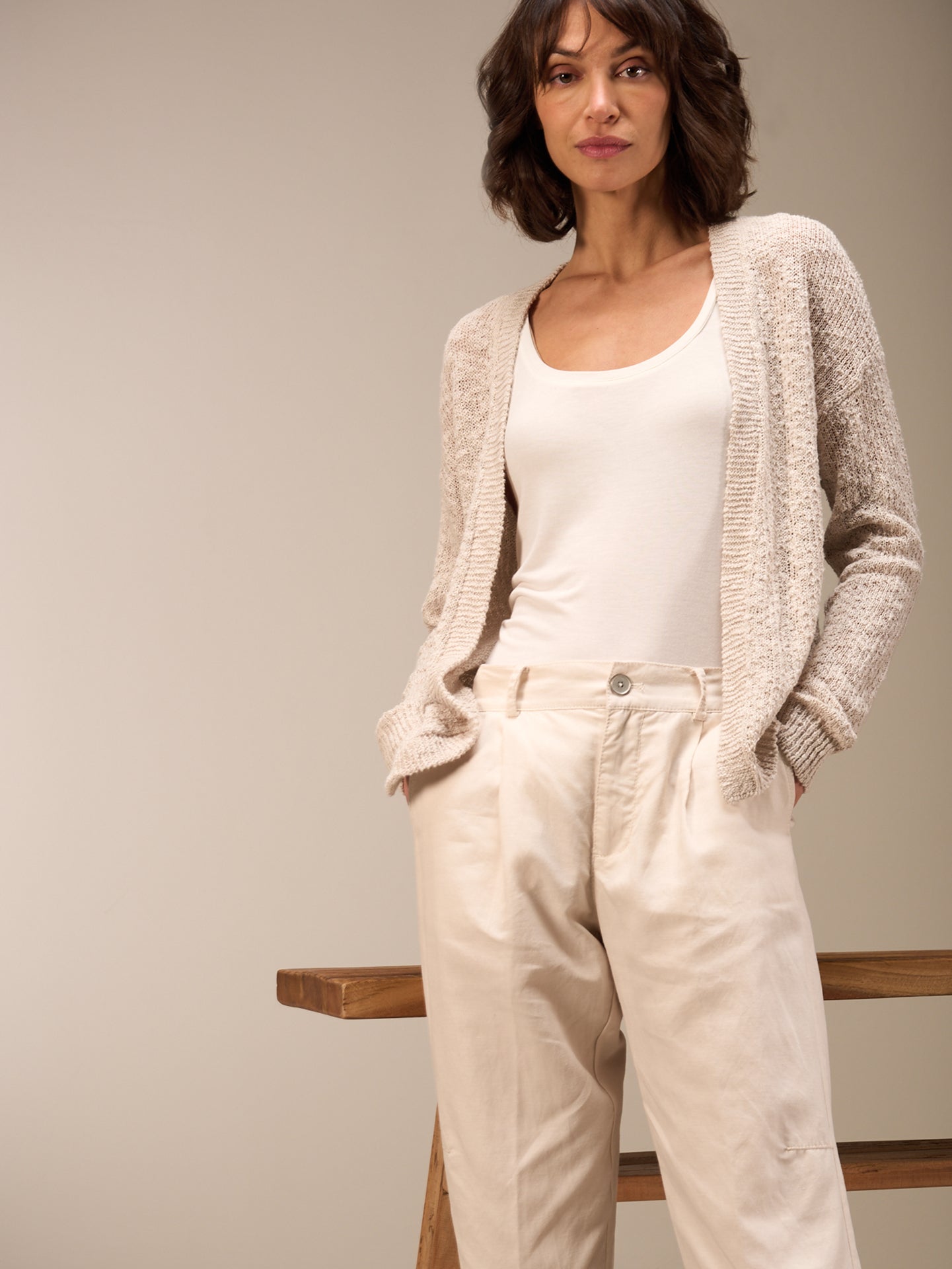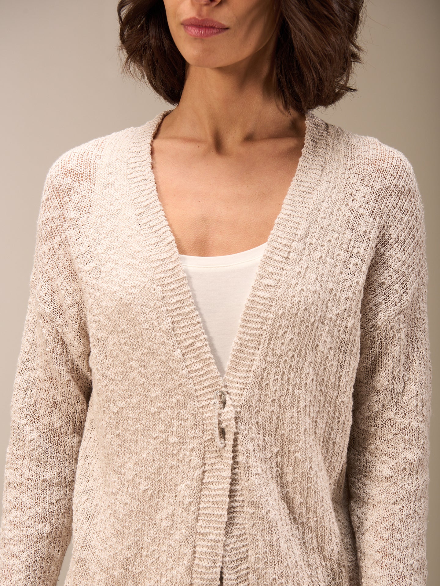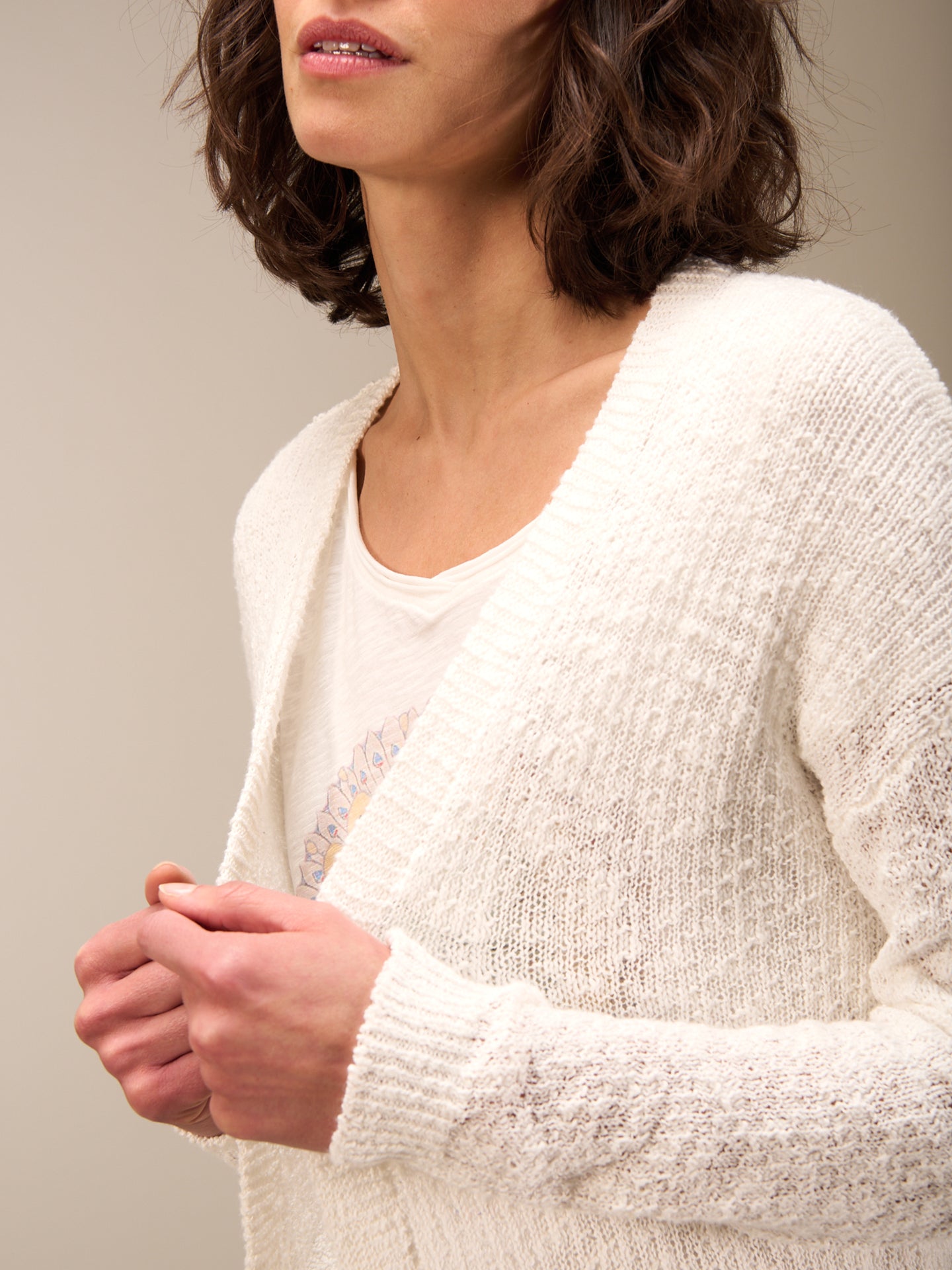 Locker geschnittene Strickjacke mit Rip-Borten an Ausschnitt, Saum und Ärmeln. Mit der Schliessnadel kann die Jacke unterschiedlich gestylt werden. Das strukturierte Garn sorgt für eine spannende Optik. Für einen hohen Tragekomfort sorgt die 92% GOTS-zertifizierte Bio-Baumwollqualität.
