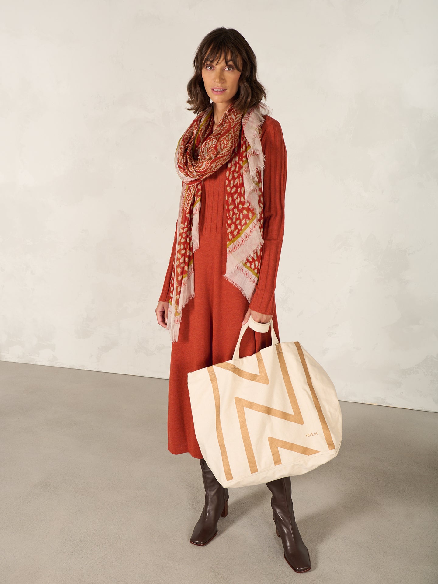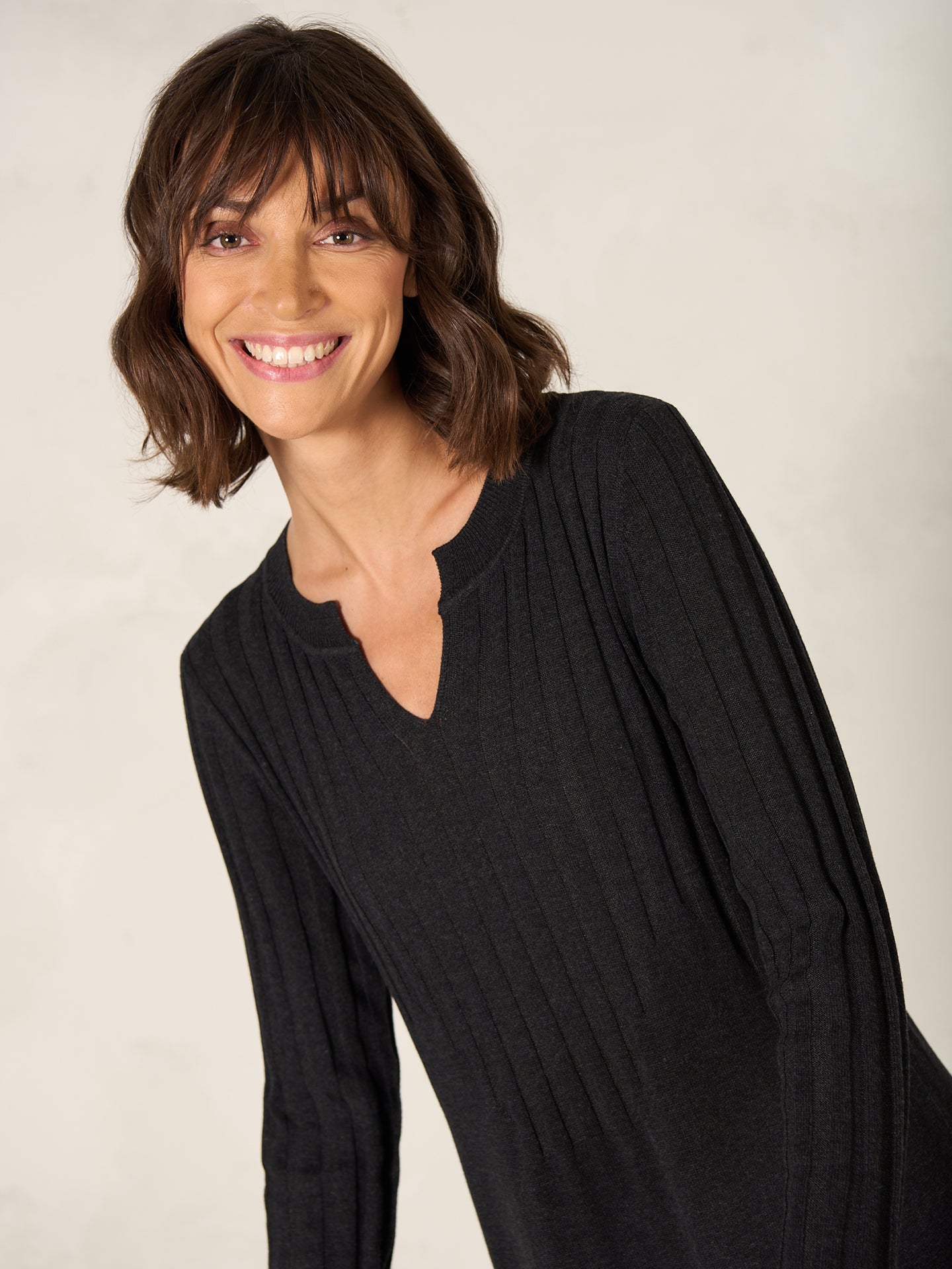 Raffiniertes Midistrickkleid mit figurschmeichelndem Strickmustermix, langen Armen mit breitem Rippmuster und einem leichten Stehkragen und V-Ausschnitt.