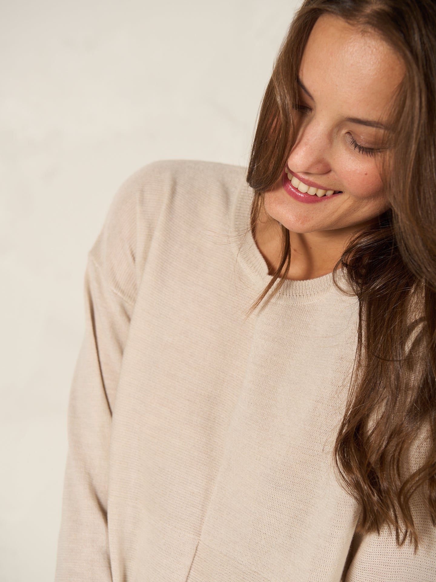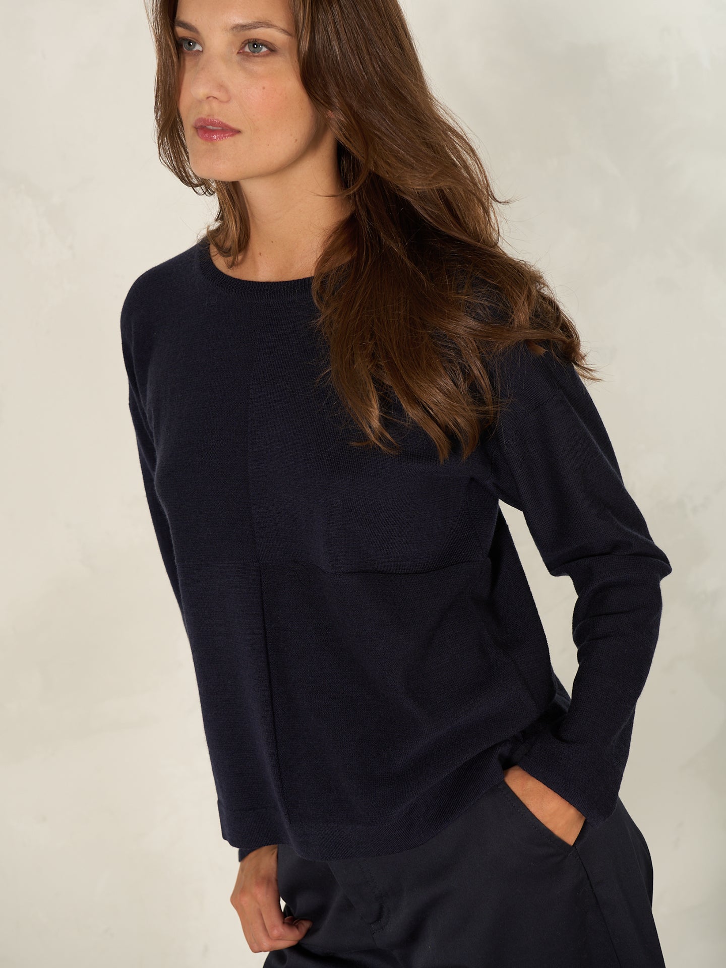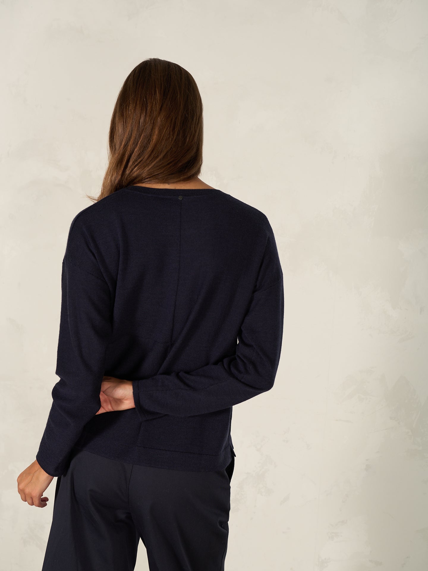 Gerade geschnittener Pullover in speziellem Melange-Garn mit Rundhalsausschnitt und überschnittenen Schultern. Die zwei Stricktechniken in Schachbrett Form und der raffinierte Schlitz am Saum machen den Pullover zum Lieblingsstück.