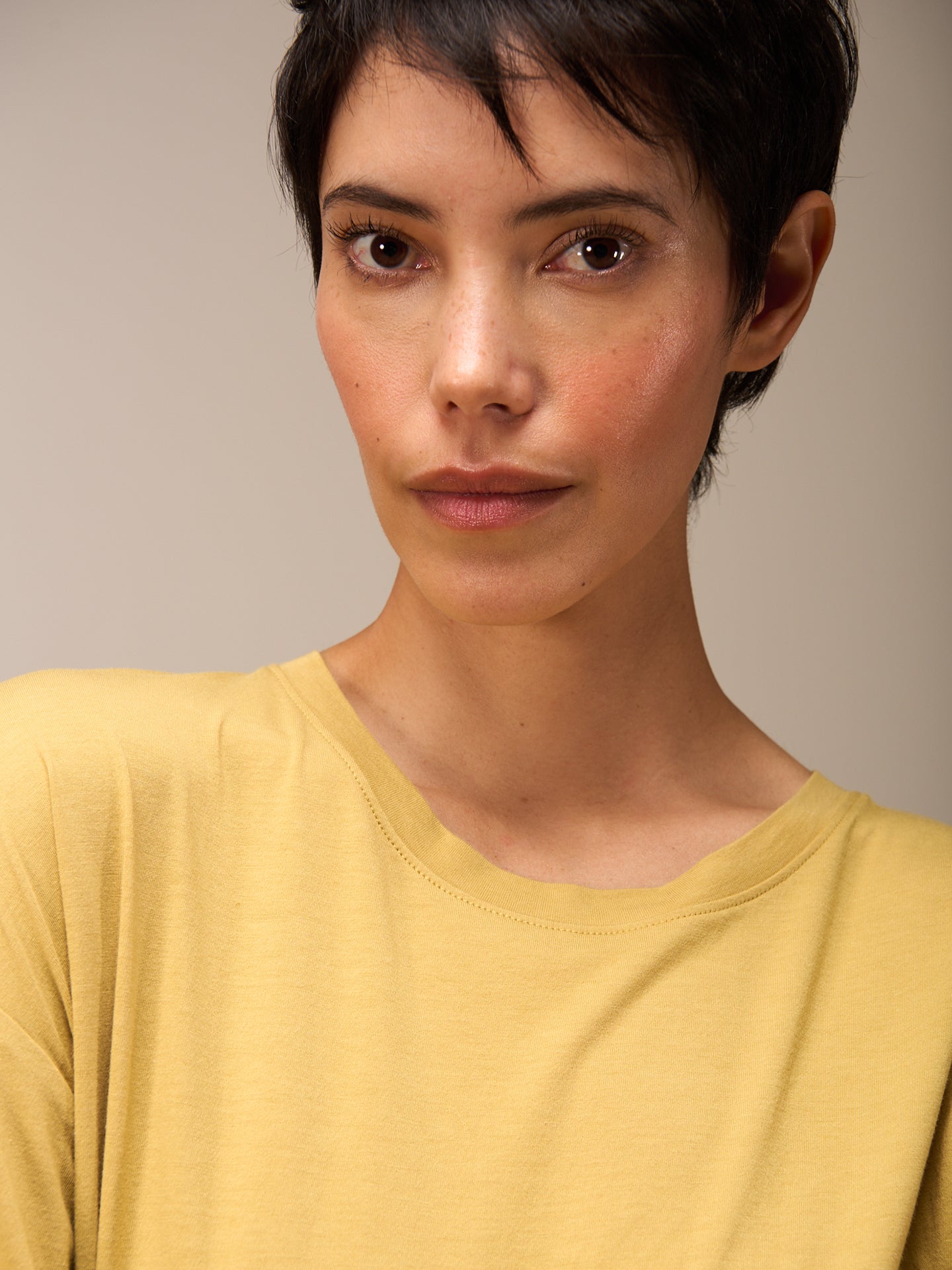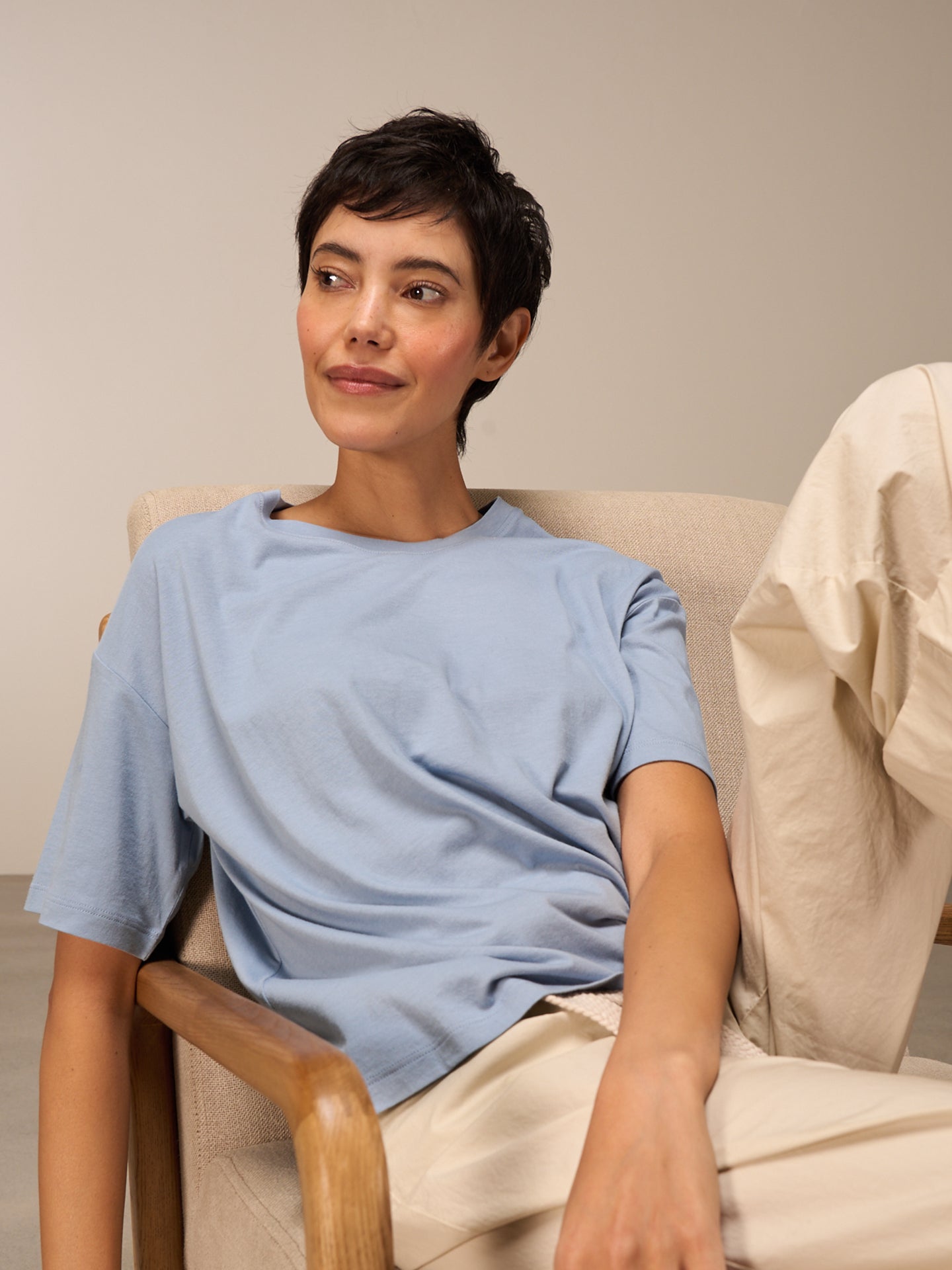 Angesagtes Kurzarmshirt in verkürzter kastiger Form mit modischem hohem Rundhalsausschnitt und weiten Ärmeln. 70% Viskose aus Bambus Fasern und 30% Bio-Baumwolle aus zertifiziertem Anbau. Stückgefärbt.