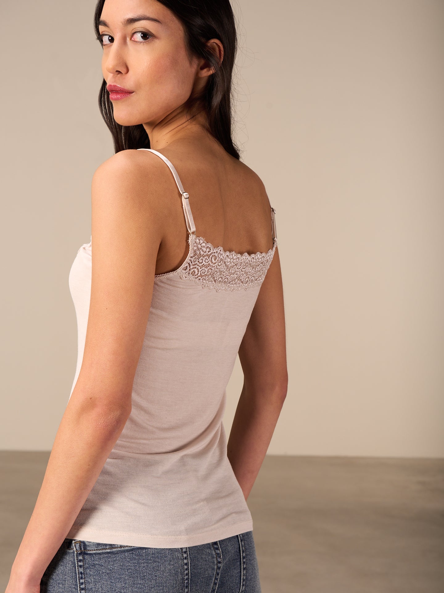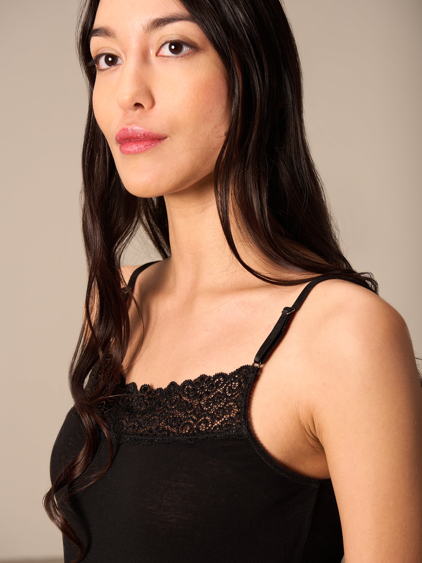 Figurbetontes Trägertop mit beidseitig tragbaren Spitzenbesatz der entweder mit geradem Abschluss oder im V Ausschnitt getragen werden kann.