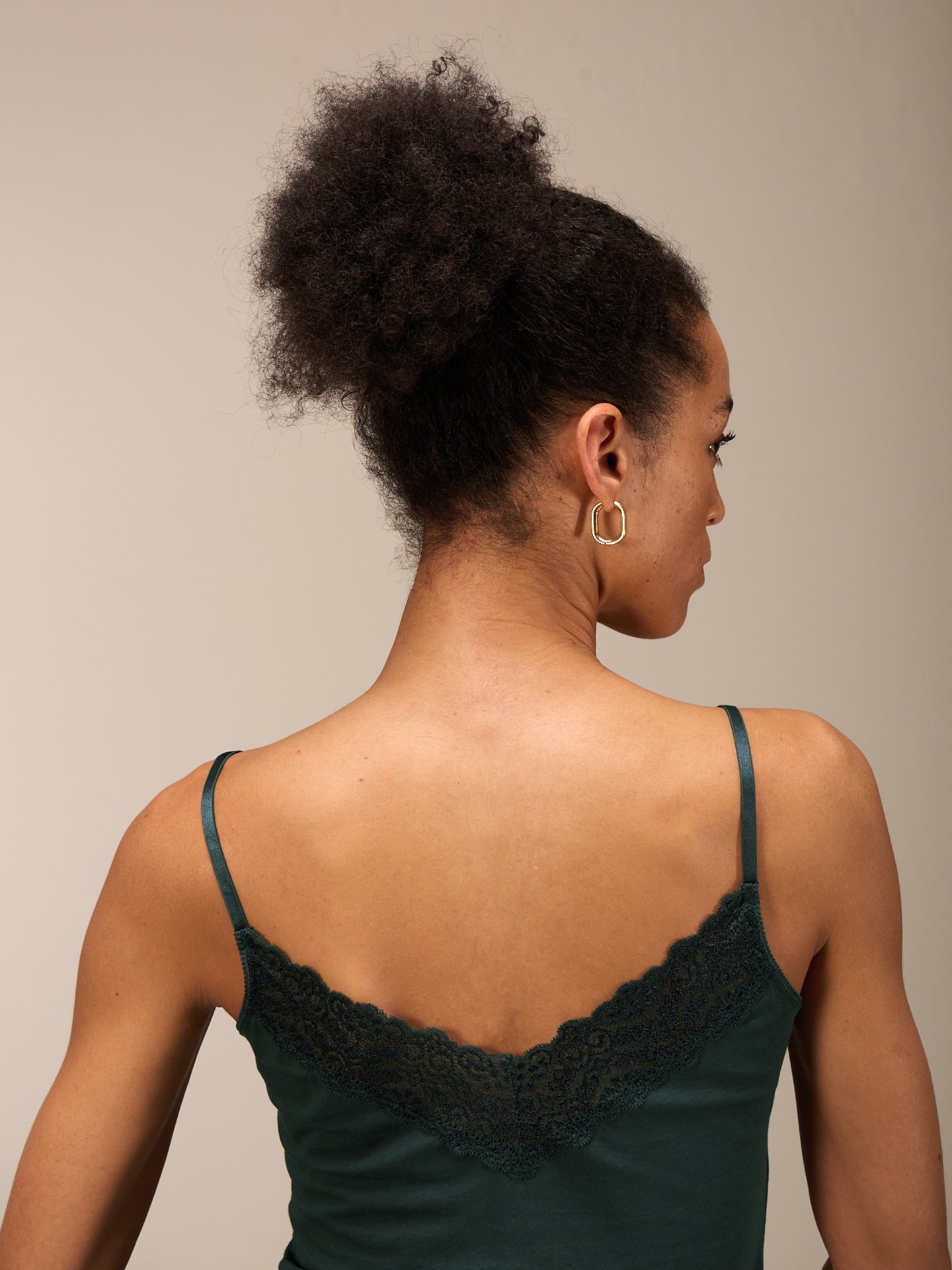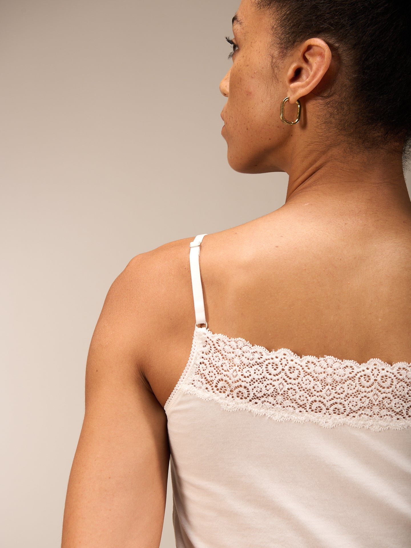 Figurbetontes Trägertop mit beidseitig tragbaren breiten Spitzenbesatz der entweder mit geradem Abschluss oder im V-Ausschnitt getragen werden kann. Die elastischen Spaghettiträger sind höhenverstellbar.