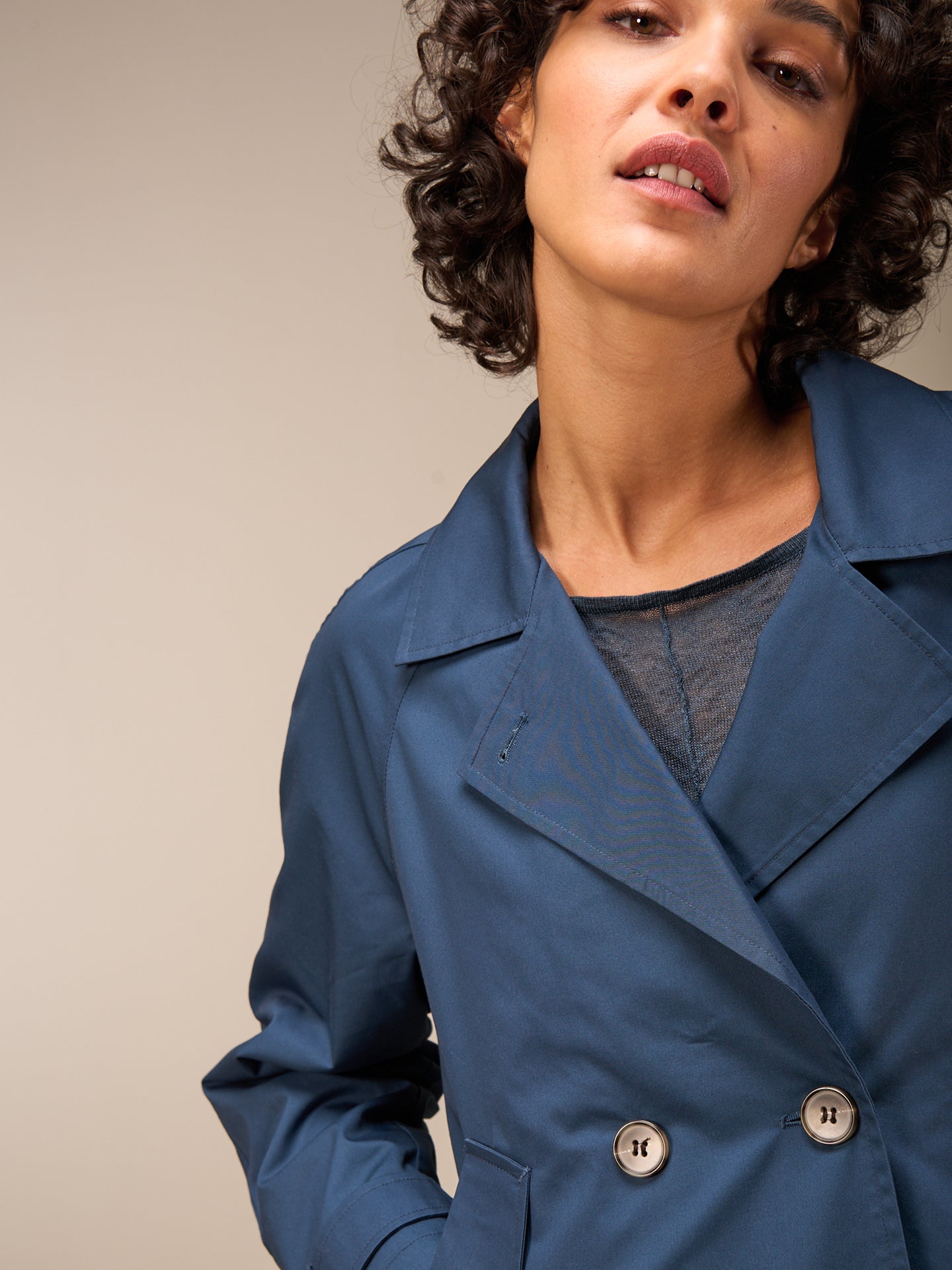 Angesagte kurze weite Frühlingsjacke in wasserabweisender Qualität in legèrer A-Form mit Reverskragen, zweireihigen Verschluss und stylischen Fake Hornknöpfen.