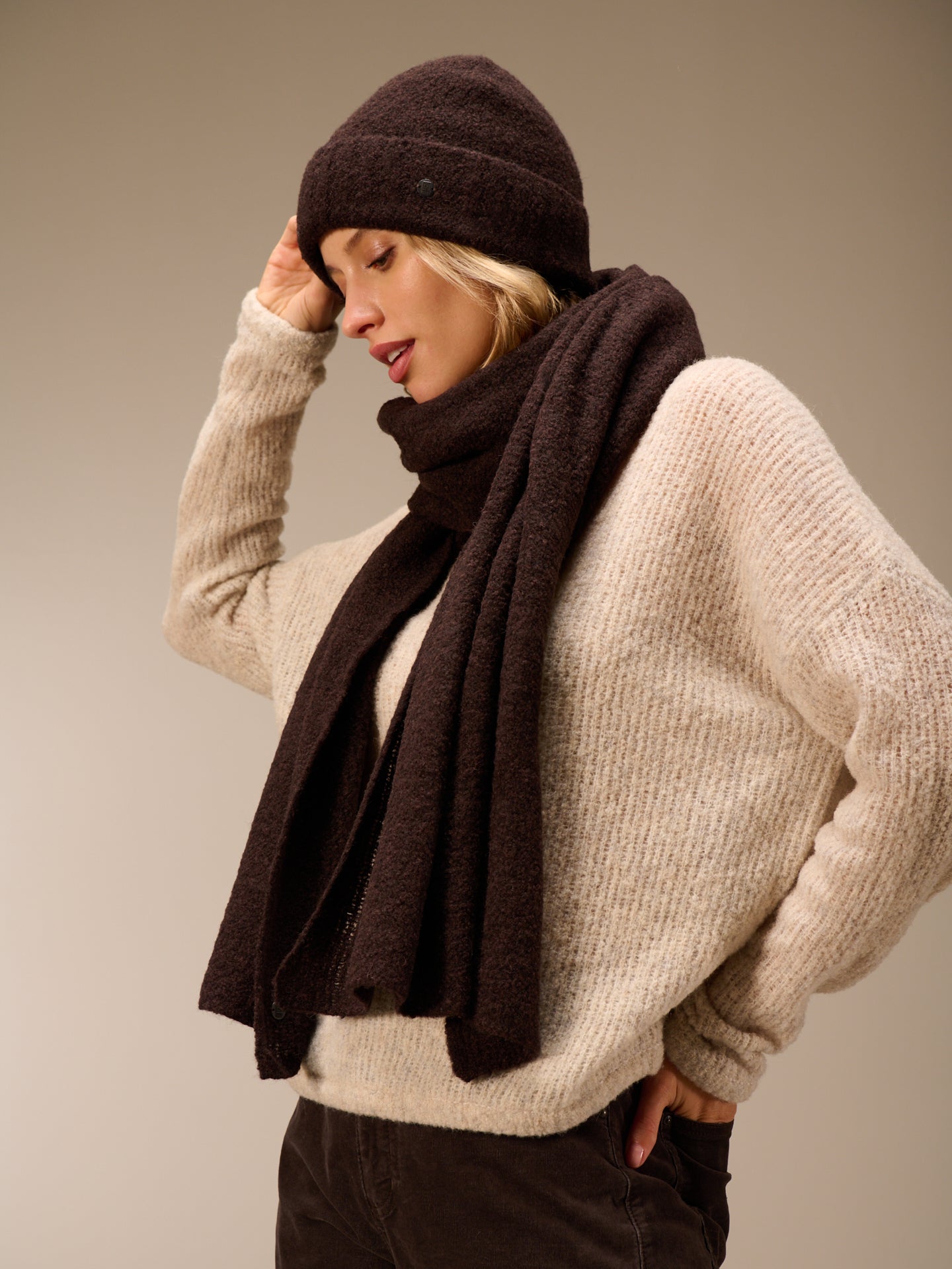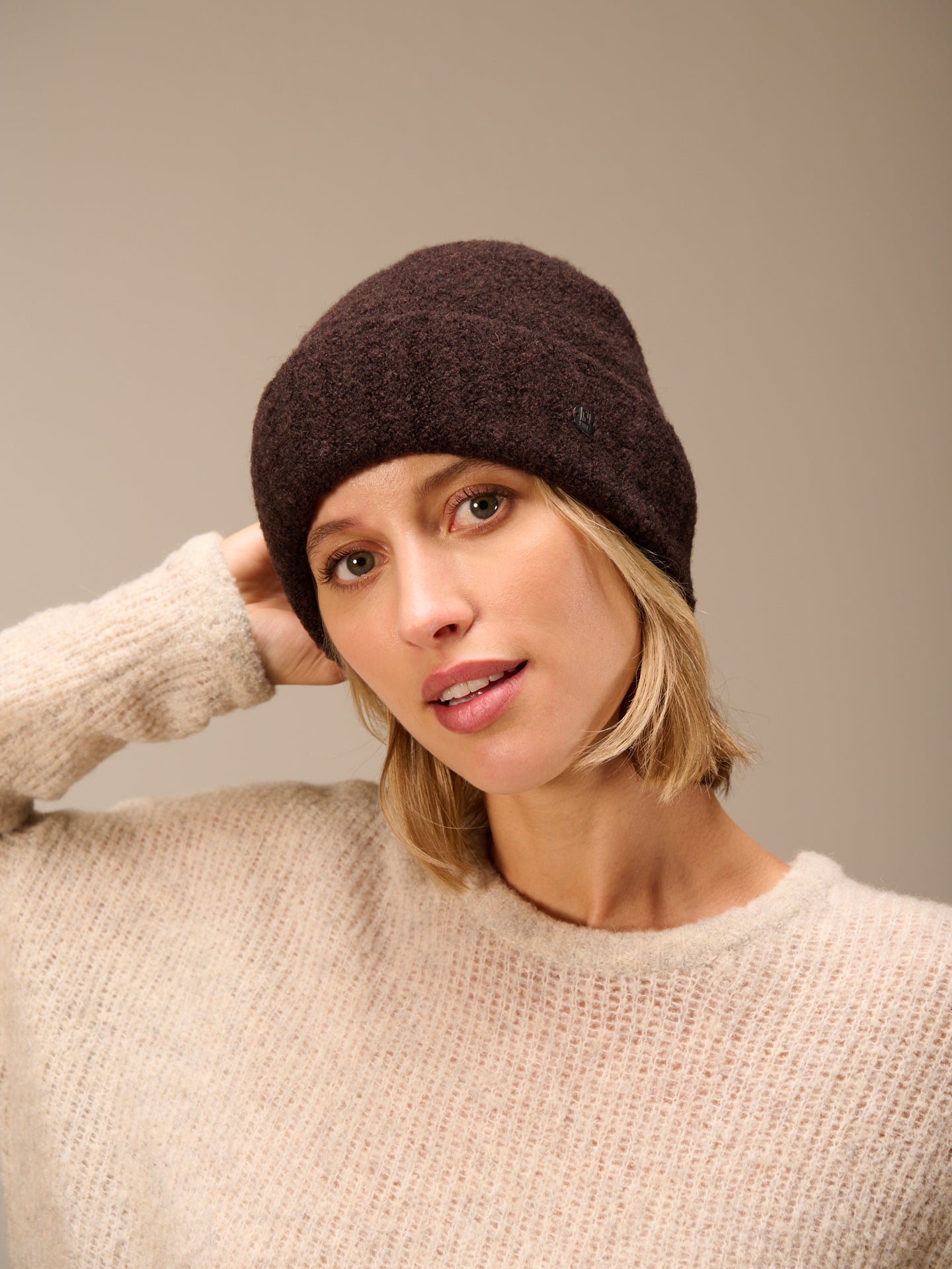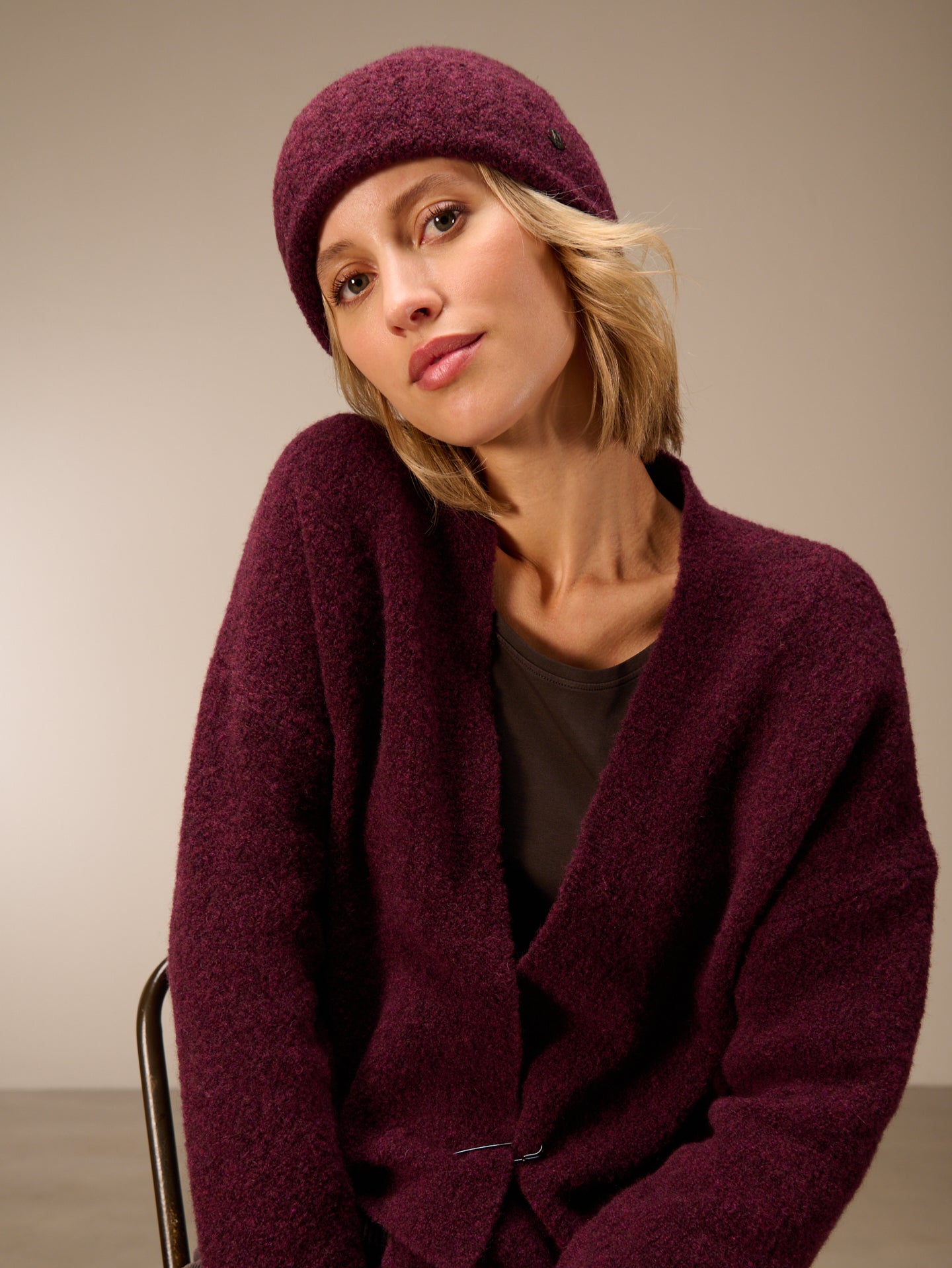 Strickmütze mit breitem Umschlag in Rippen Optik.