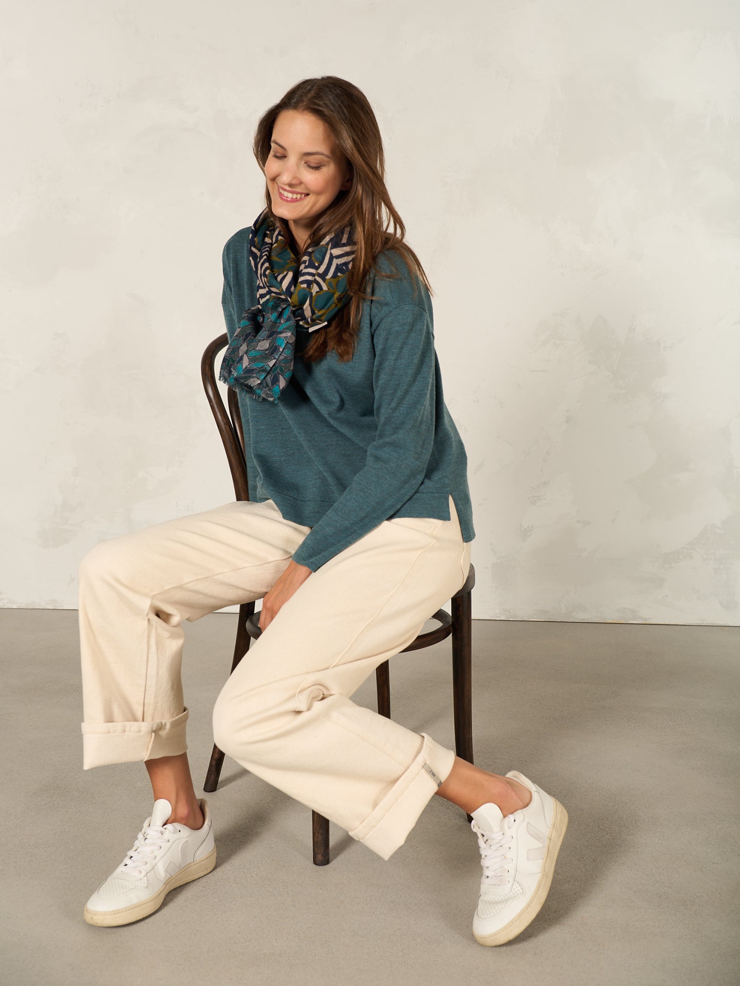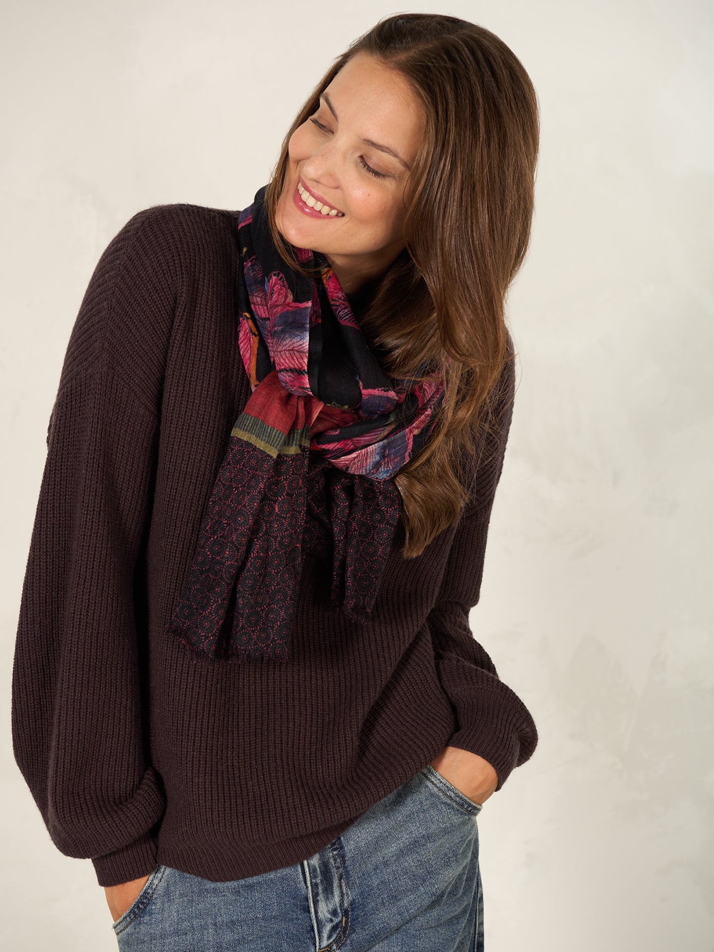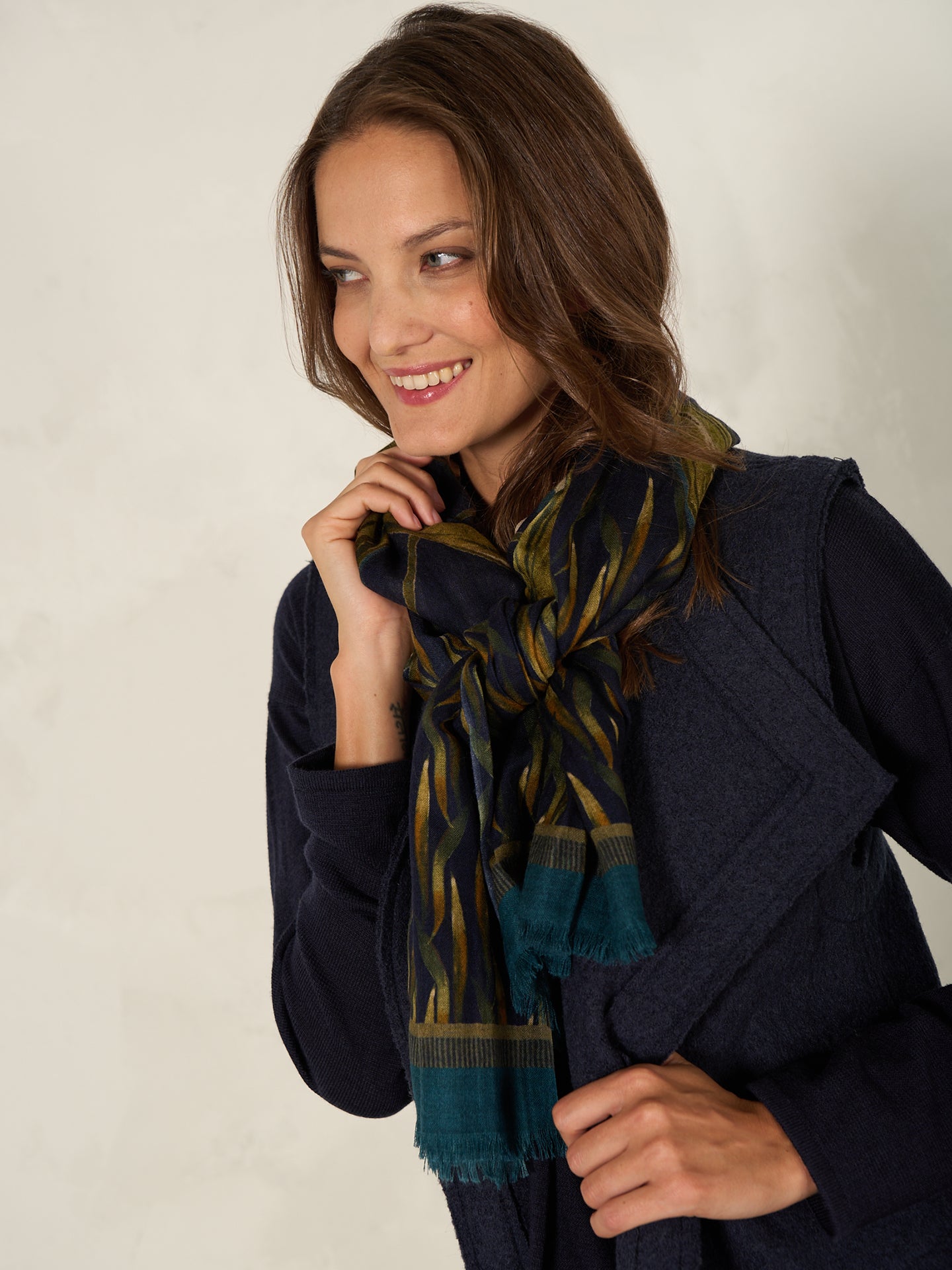 Dekorativer und wärmender Schal in der Grösse 70 x 200 cm aus 100% Wolle. Der Schal ist mit handgezeichneten Prints vollflächig bedruckt und hat kürzere Kanten mit Fransen und macht ihn so zu einem perfekten Begleiter für drinnen und draussen.